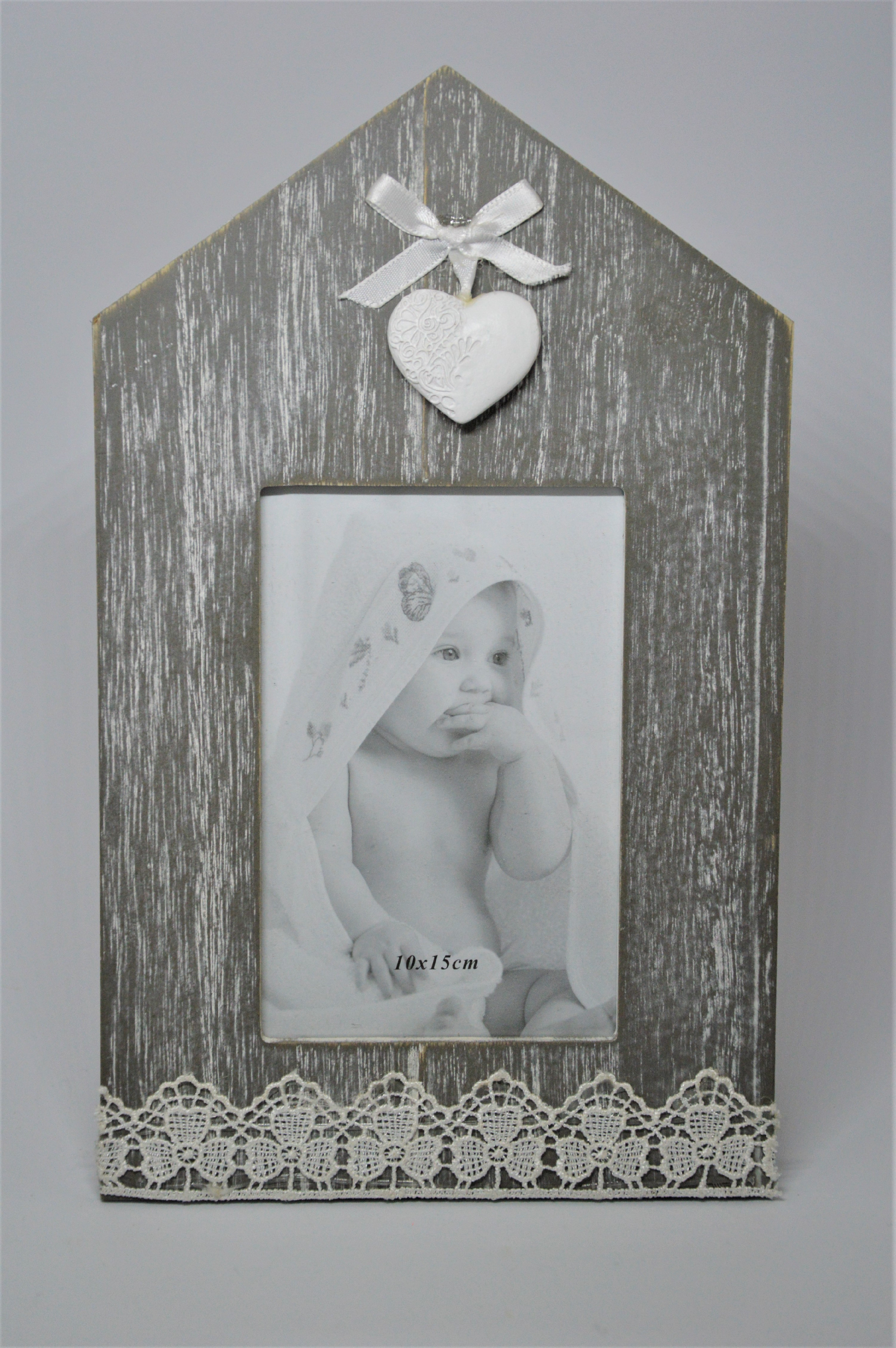 Krajkový fotorámeček se srdíčkem - šedý dřevěný rámeček ve tvaru domečku je zdobený bílým srdíčkem a mašličkou, spodní okraj ozvláštňuje krajka.