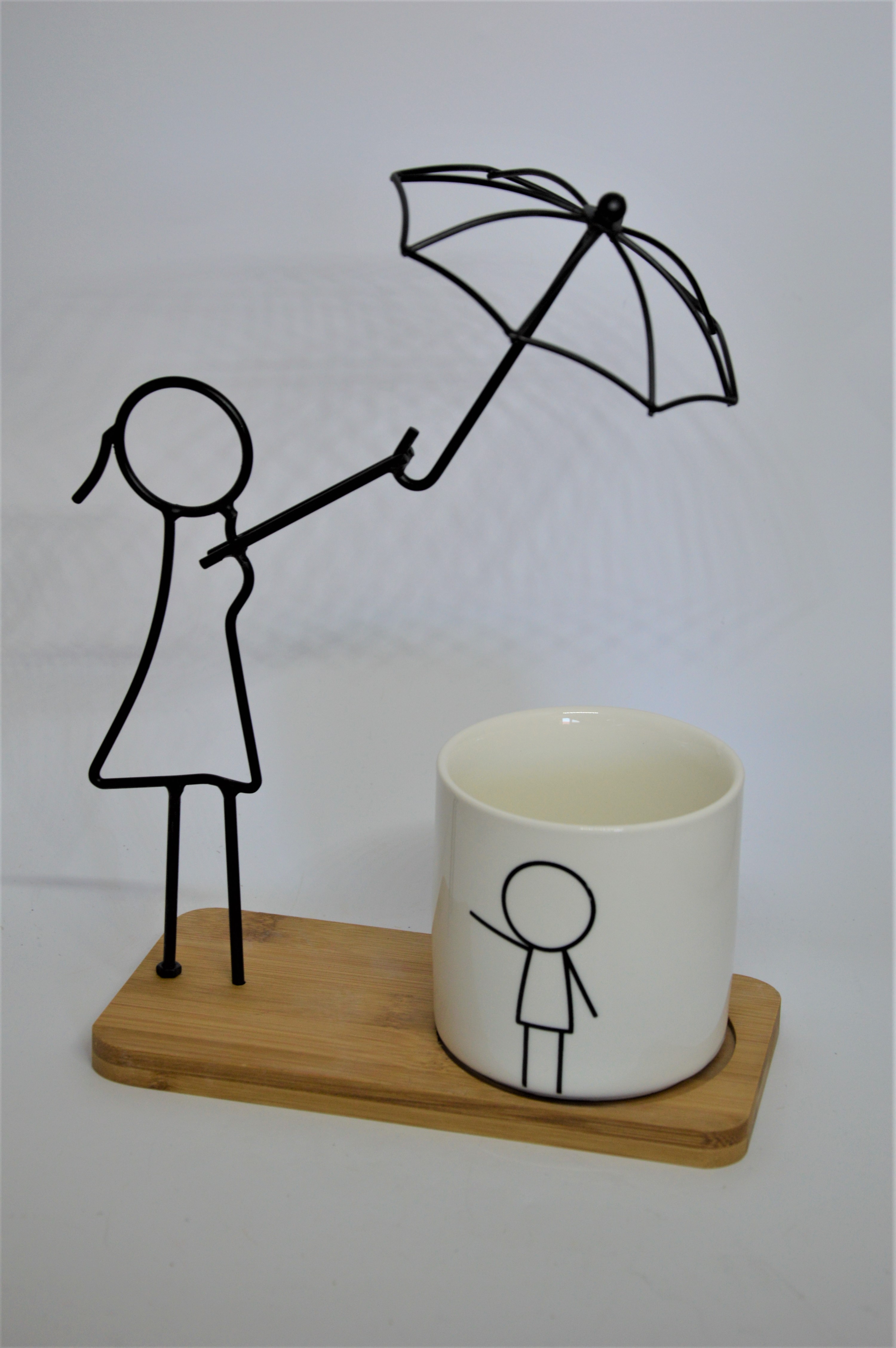 Rozměry květináče: 9 x 9 x 9 cm, výška figurky s deštníkem 27 cm, délka podložky cca 20 cm.