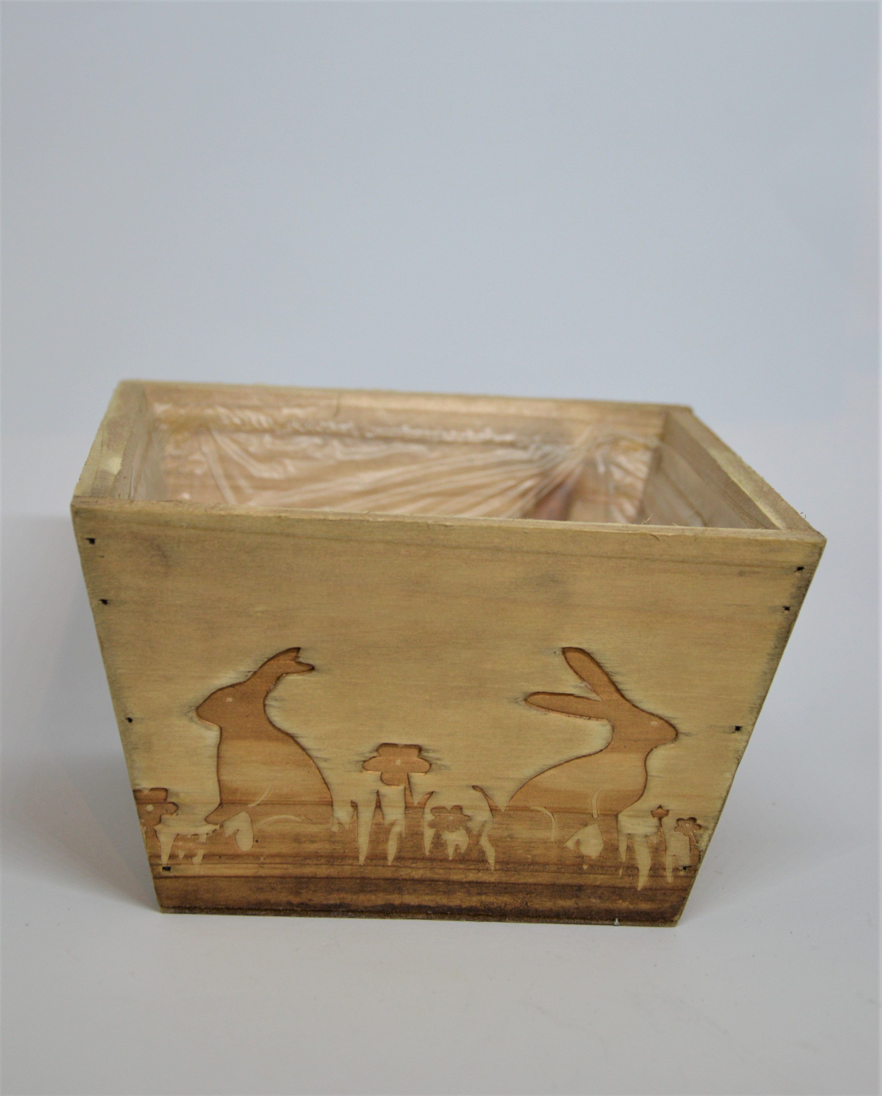 Květináč se zajíčky - obal na květiny ze dřeva s igelitovou vložkou a dekorem zajíčků zpestří váš domov nejen v čase Velikonoc.
