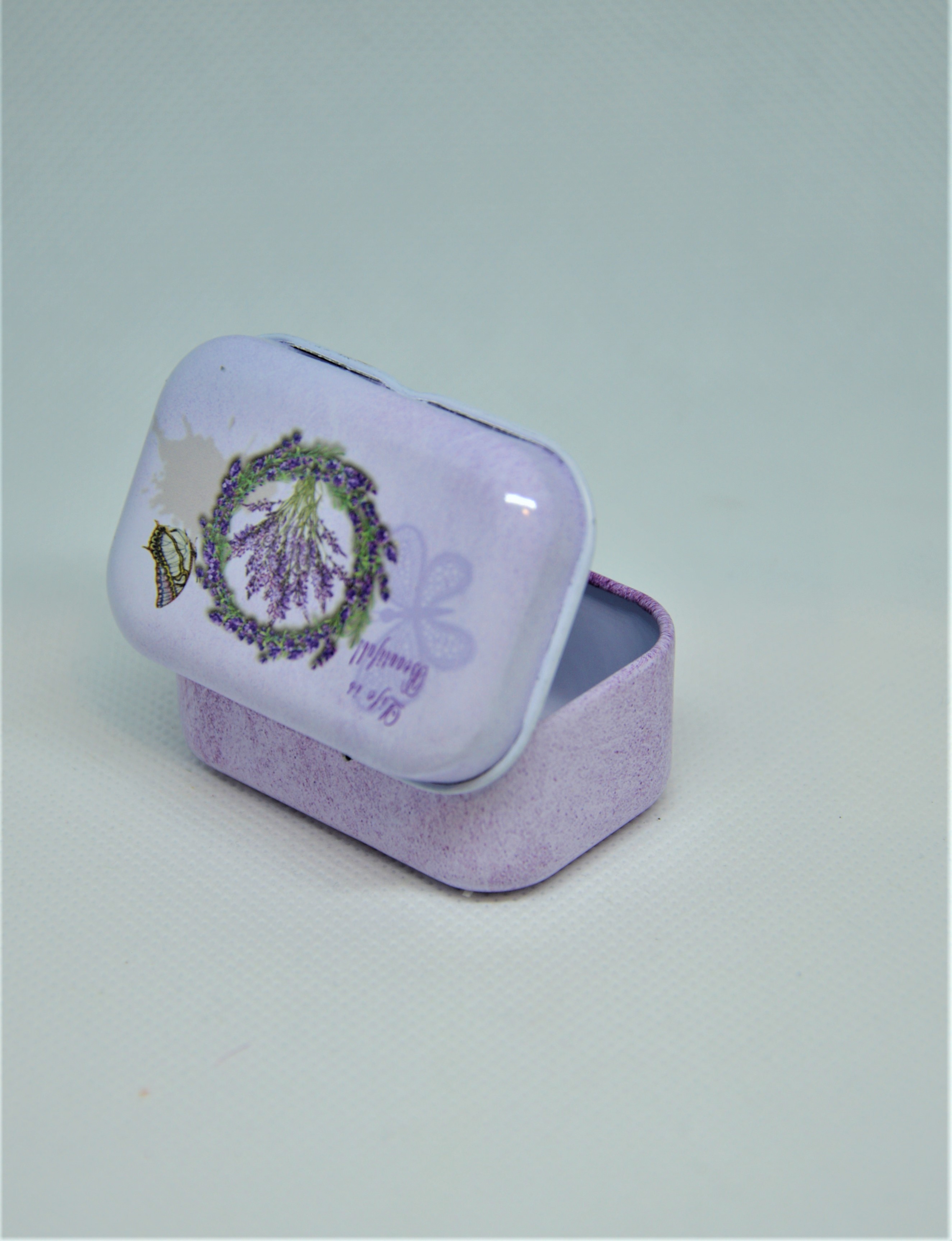 Levandulová mini plechová krabička představuje skvělý dárek pro milovníky vintage stylu. Využijete ji na sladkosti, na šperky (náušnice, prsteny) nebo třeba jako pouzdro na sluchátka.