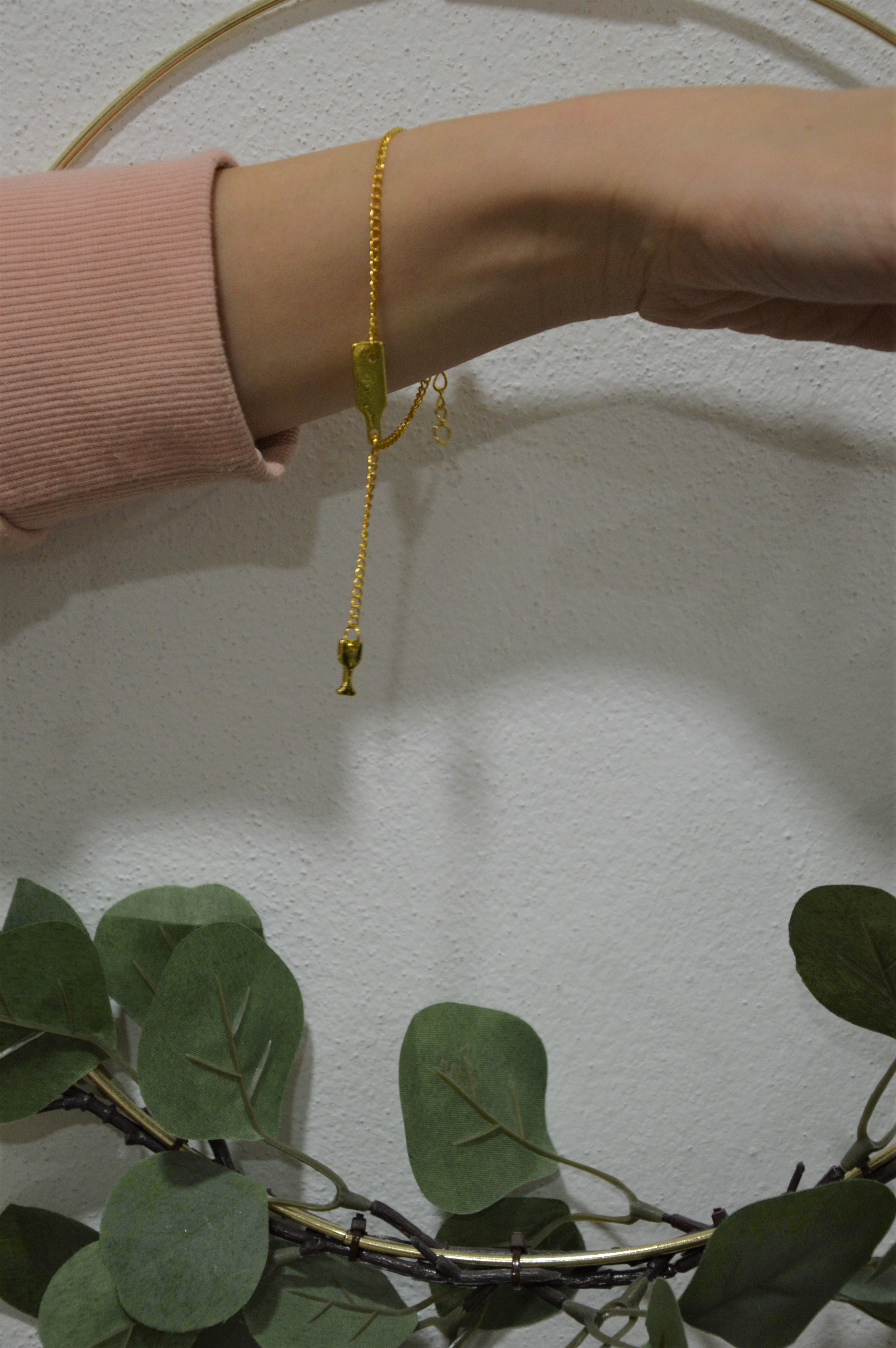Náramek se sklenicí a lahví vína - jemný, zlatý decentní náramek s motivem sklenice a lahve vína se skvěle hodí jak pro všechny milovnici lahodného nápoje z hroznů, tak i pro milvnice originálních šperků.