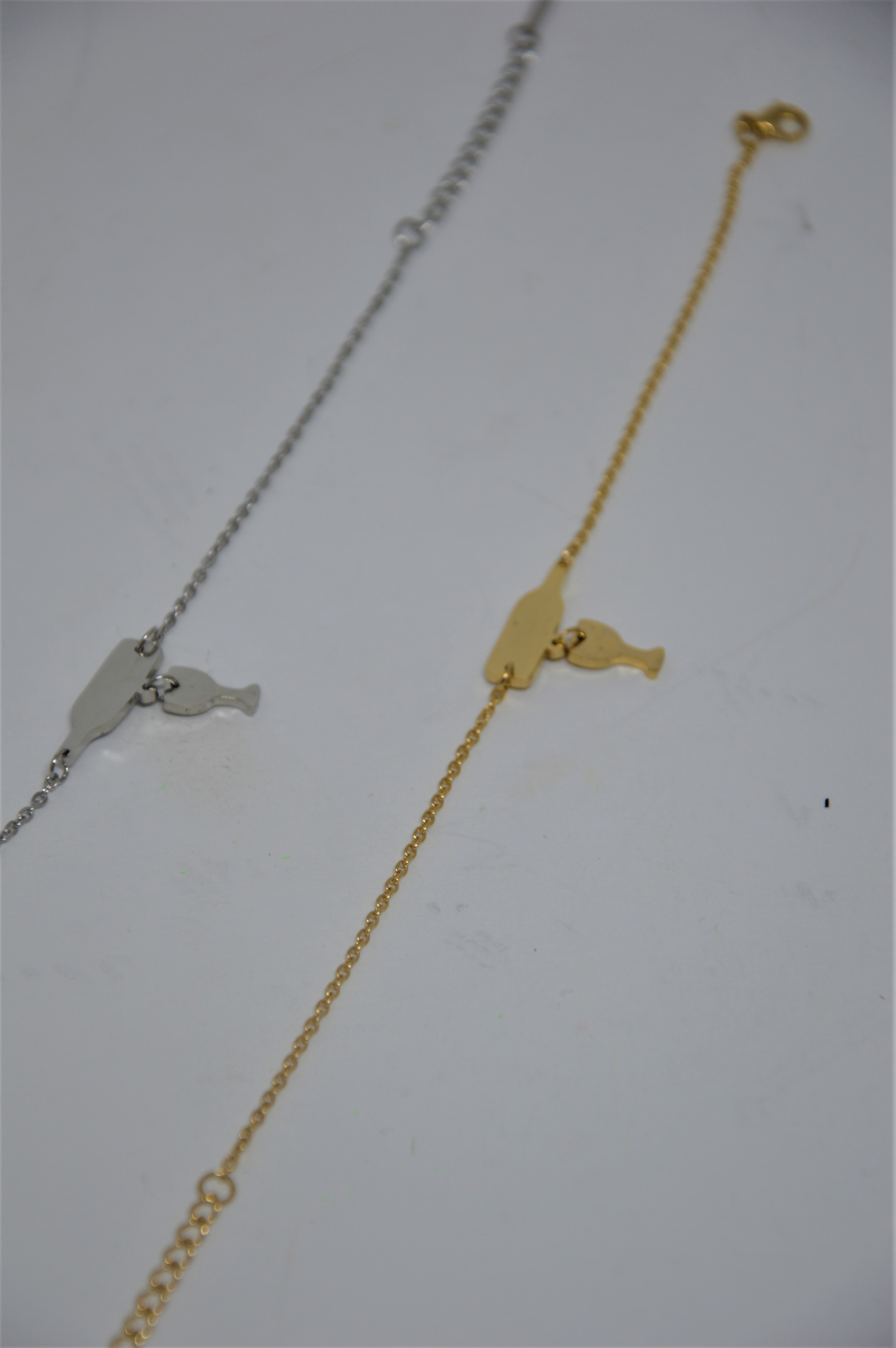 Náramek - sklenička s lahví - jednoduchý lesklý náramek s originálním přívěskem, který tvoří láhev a sklenička. Díky tomuto specifickému designu si ho zamilují hlavně všechny milovnice dobrého vína.