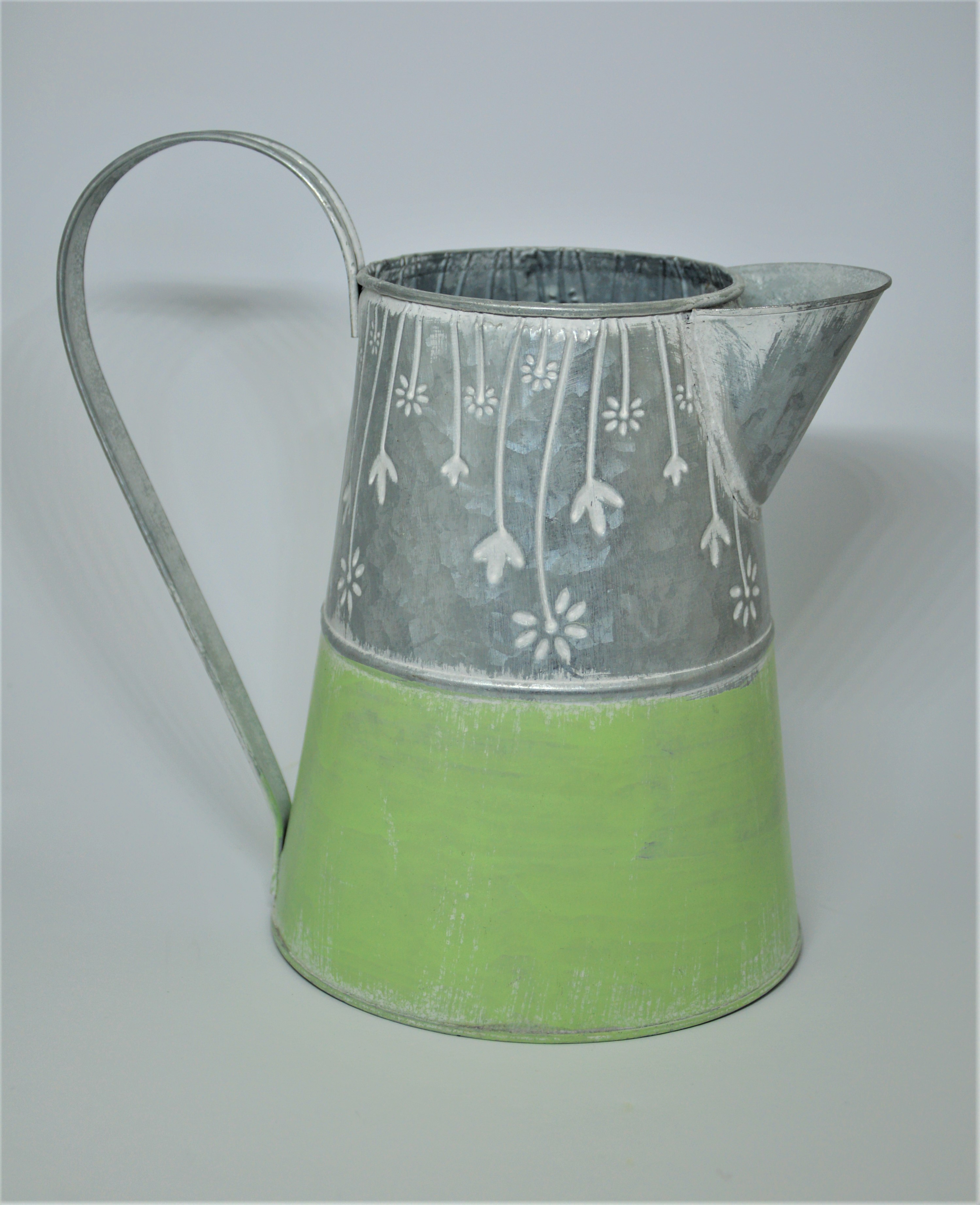 Plechová konvička s květinami - plechová konvička v barevné kombinaci pastelově zelené a šedé, zdobená bílými květinami poslouží jako krásná, nejen jarní dekorace. Džbán nejlépe vynikne při aranžování květin.