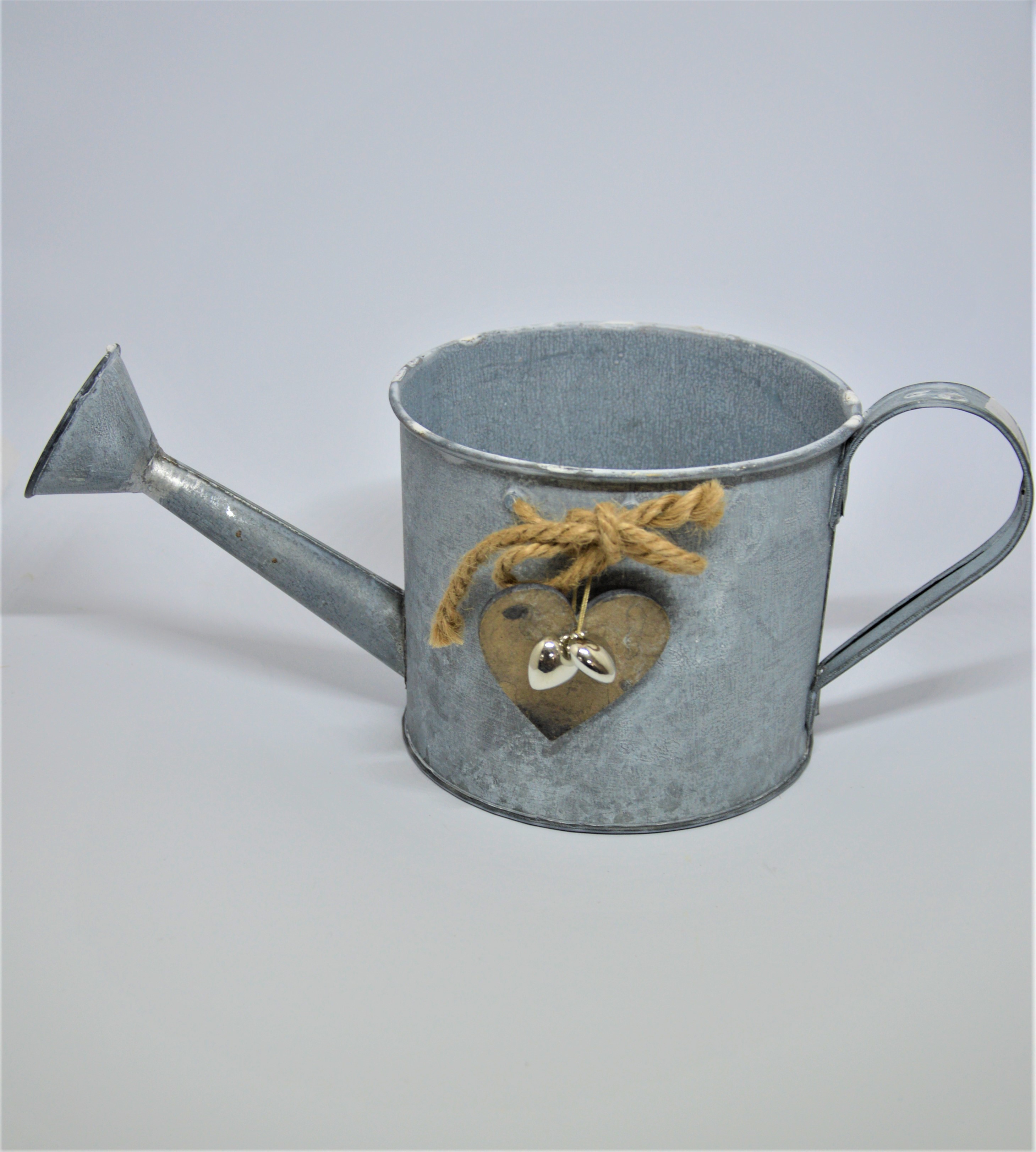 Plechová konvička s provázkem a srdíčkem - jednoduchou plechovou konvičku se zajímavými detaily využijete hlavně jako dekoraci. Postavit ji můžete do interiéru, na terasu i do zahrady. Využití najde třeba pro krásné květinové aranžmá.
