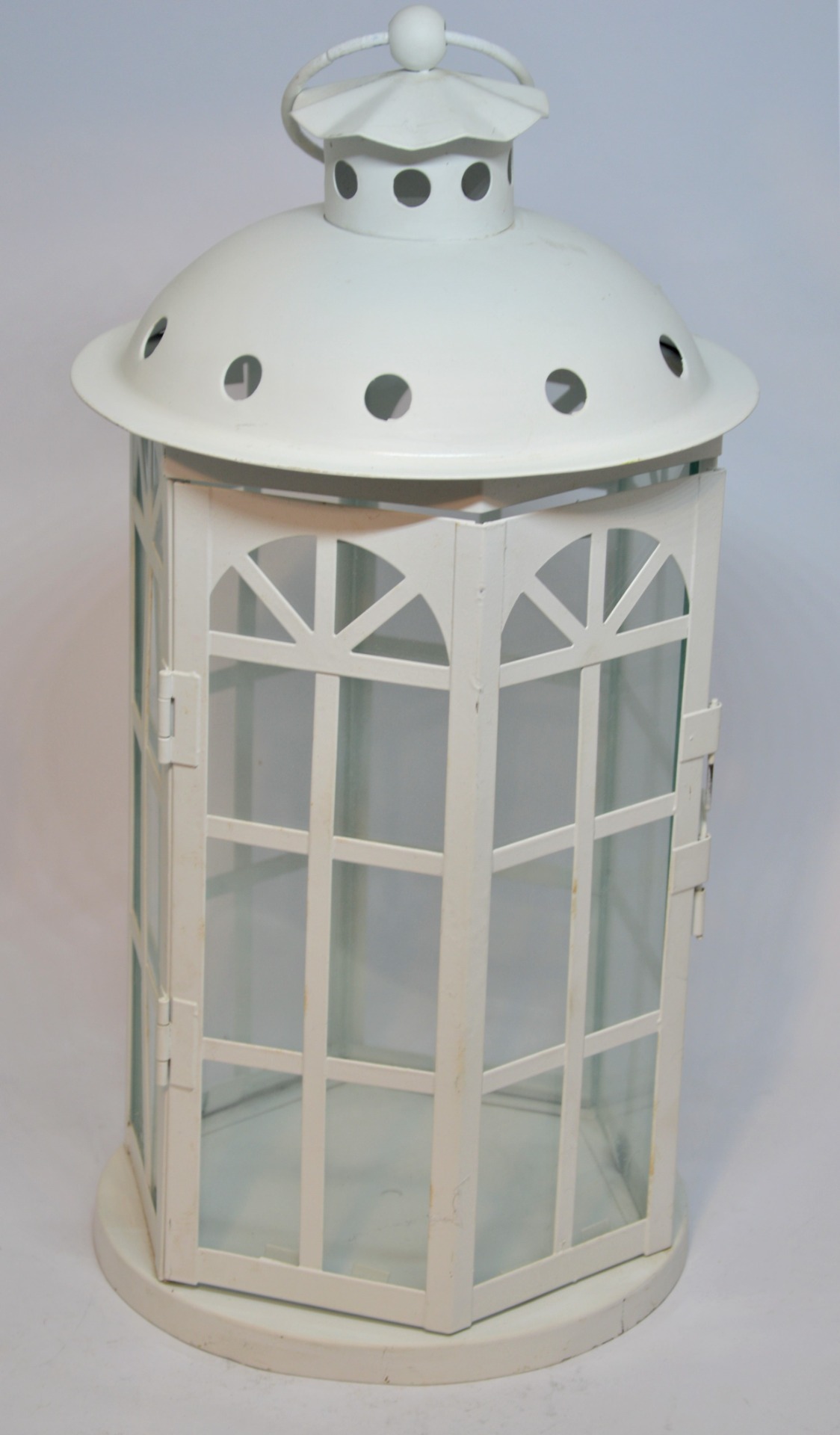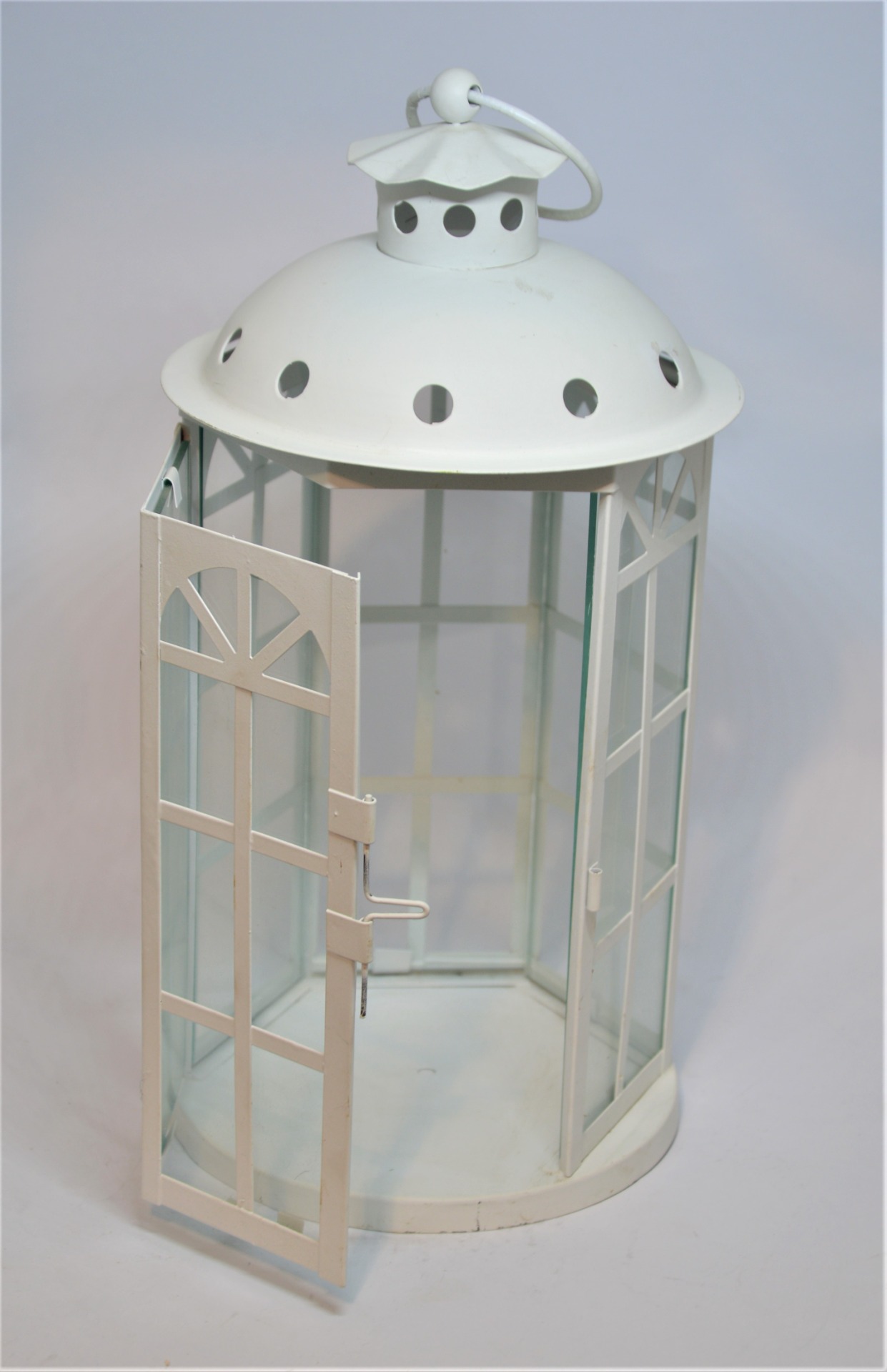 Bílá plechová lucerna - na zavěšení, s prosklenými okénky, jednoduchá, působivá, elegantní. Oživí každý nudný, tmavý kout.