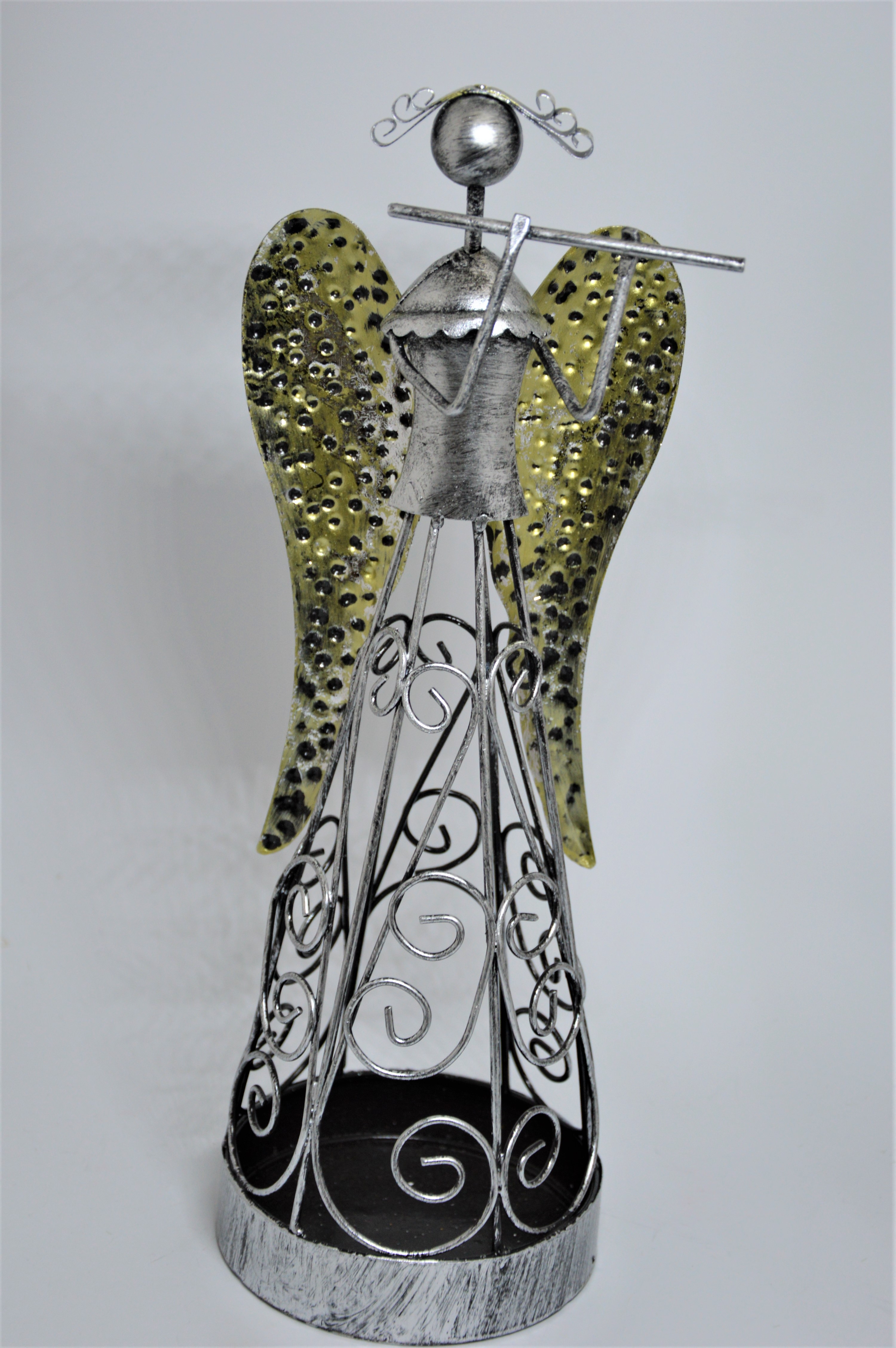 Plechový anděl s flétnou – krásný kovový anděl držící v ruce flétnu má v sukni kalíšek na čajovou svíčku.
