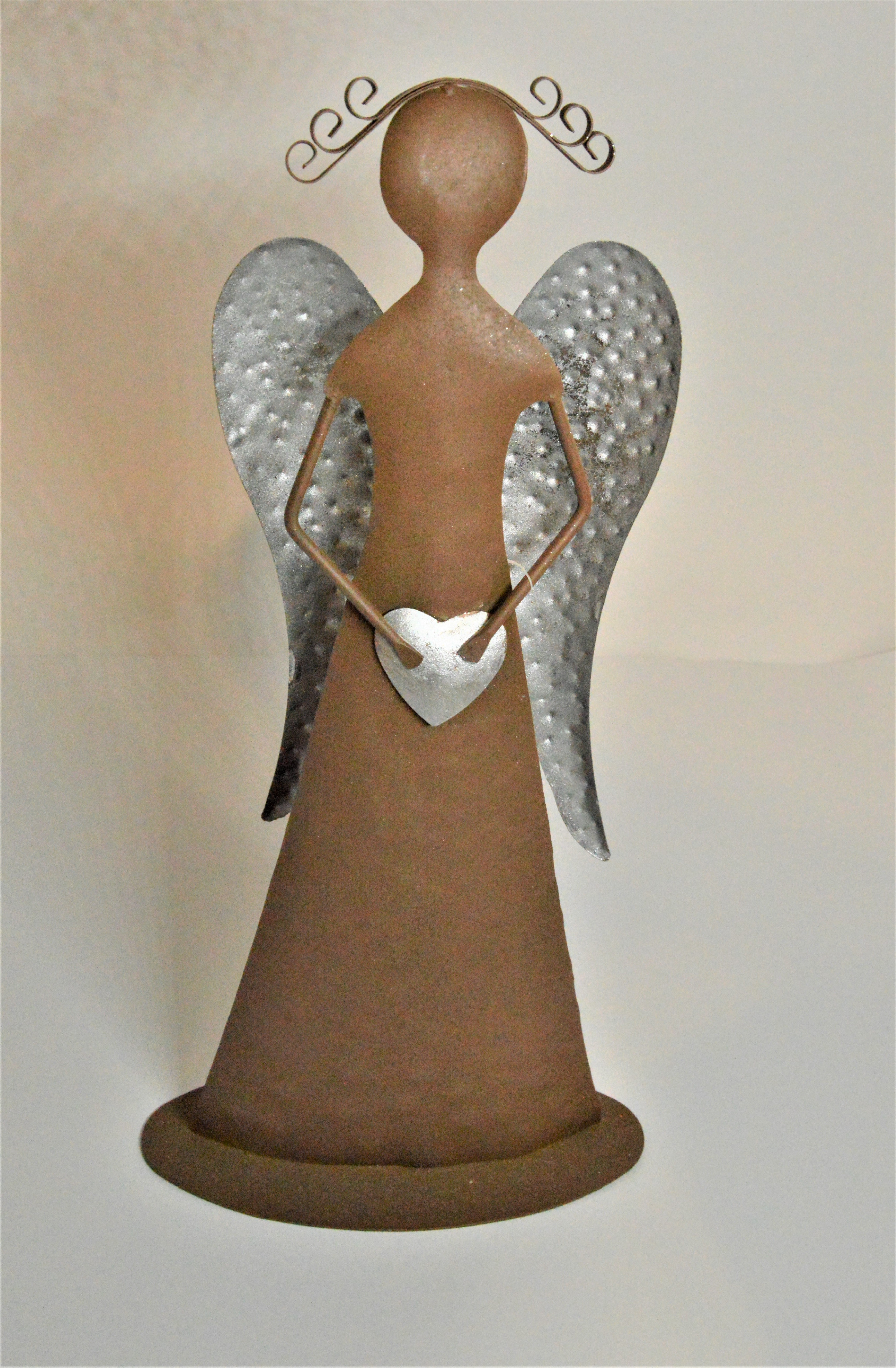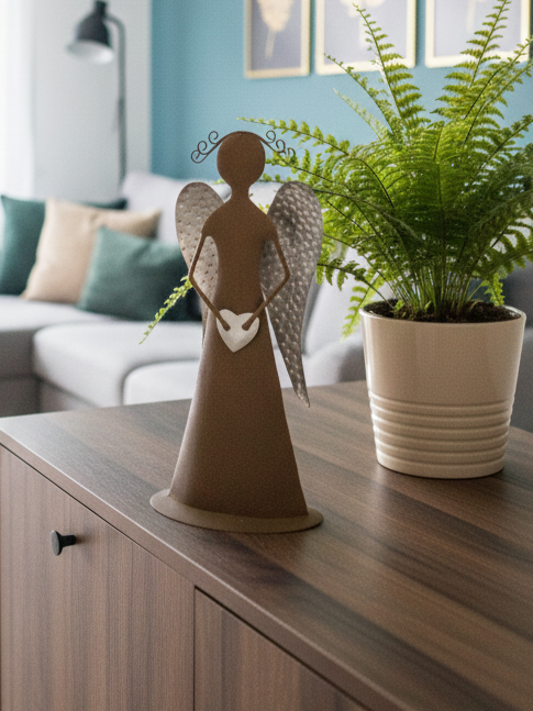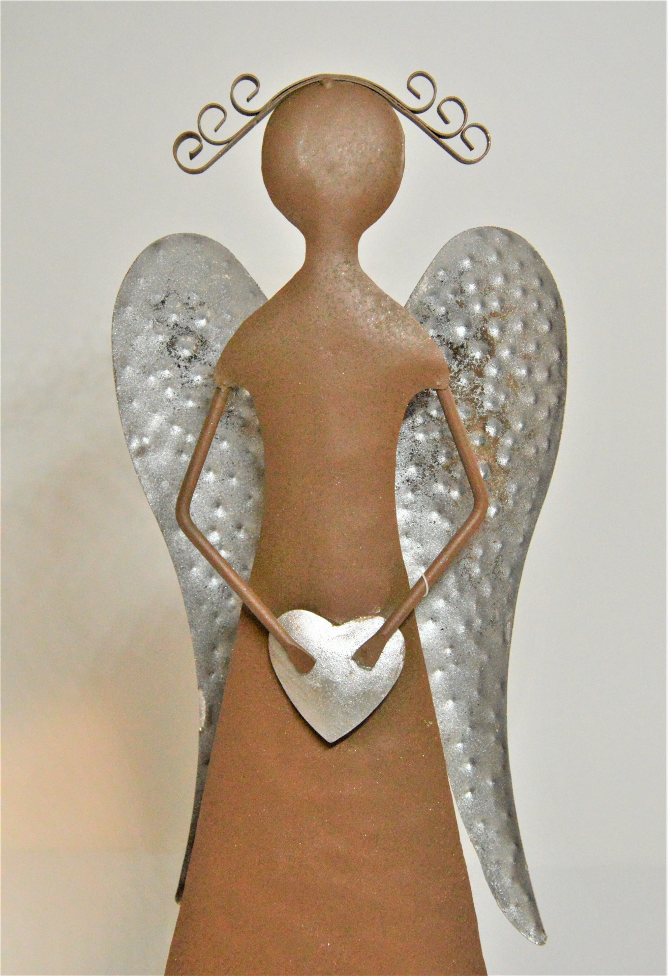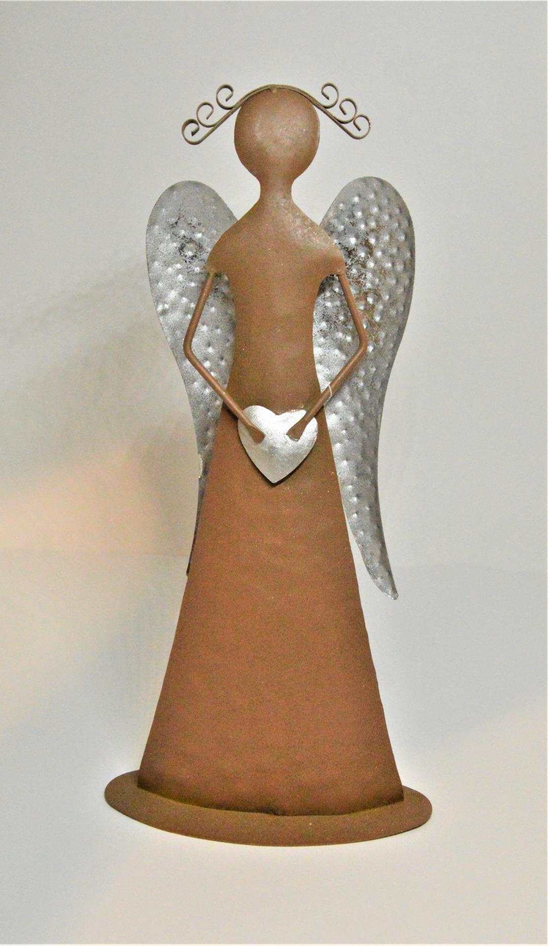 Plechový anděl - hnědý s šedými křídly, šedým srdíčkem a kudrnatými vlásky. Díky svému designu se hodí jako krásná celoroční dekorace především do moderně pojatých interiérů.