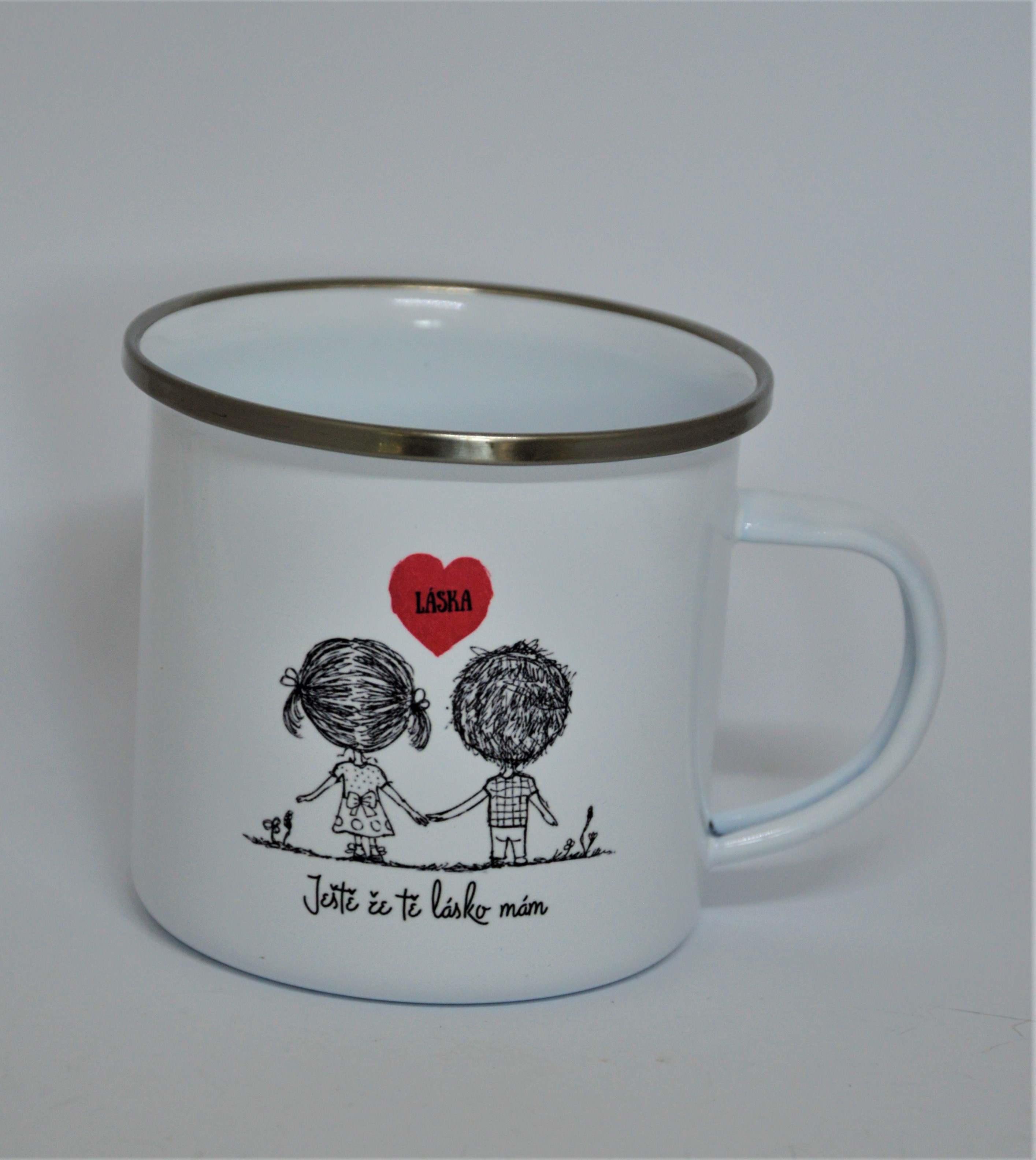 Plechový hrníček s potiskem Ještě že tě lásko mám - bílý romantický plechový hrnek potěší díky krásnému potisku všechny romantické duše. Stane se tak perfektním vyznáním lásky.