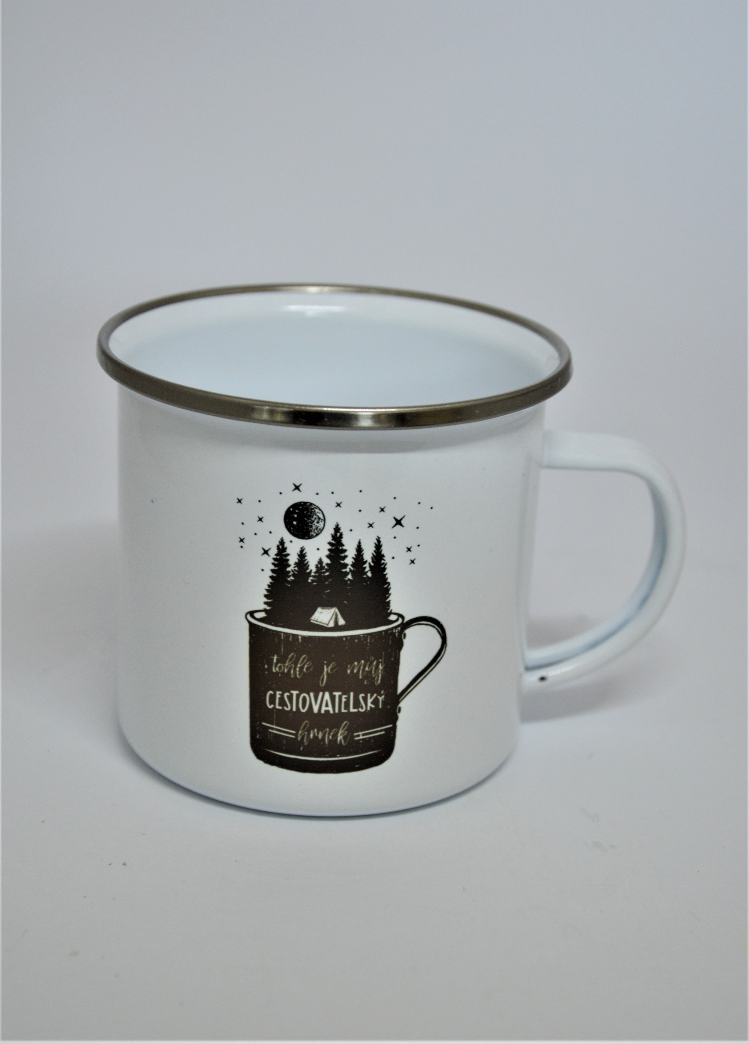 Plechový hrníček s potiskem Tohle je můj cestovatelský hrnek - bílý plechový hrnek potěší všechny milovníky turistiky a cestování.