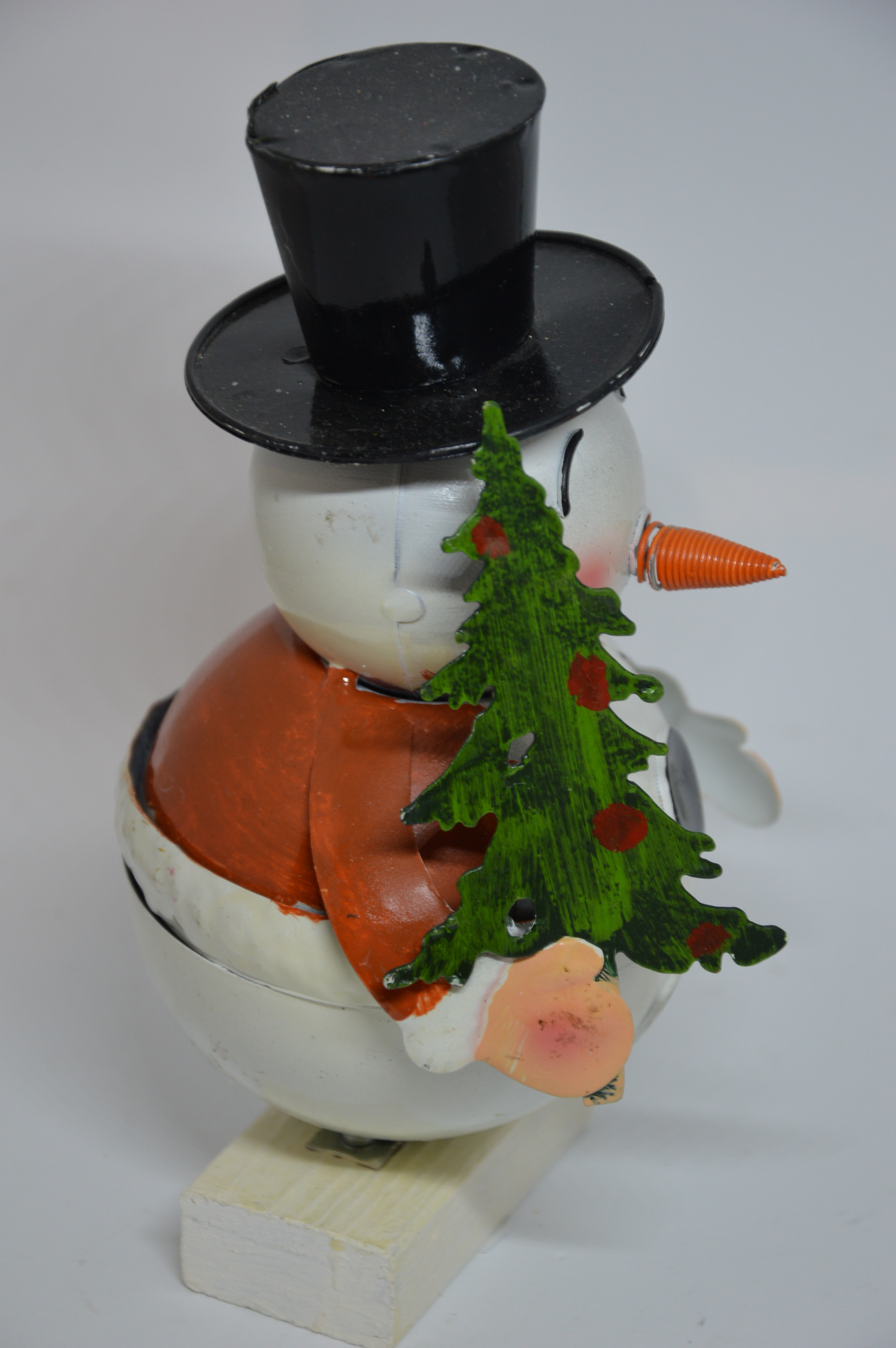 Plechový sněhulák - veselý plechový sněhulák v cylindru drží v ruce vánoční stromeček. Stojí na dřevěném podstavci, takže je dostatečně stabilní a umístit ho můžete kamkoli.
