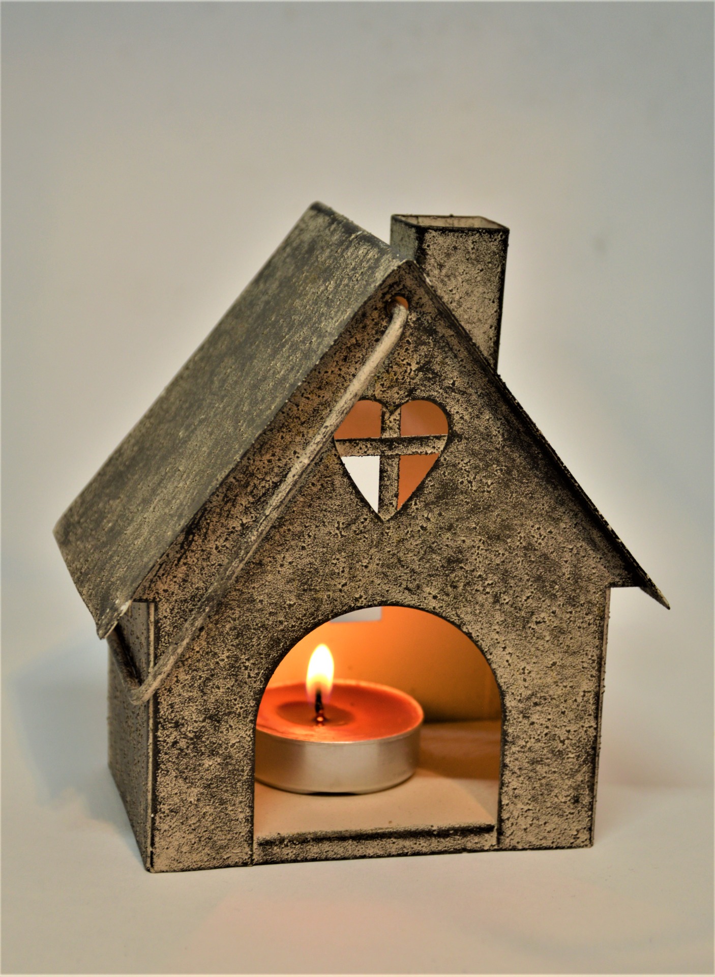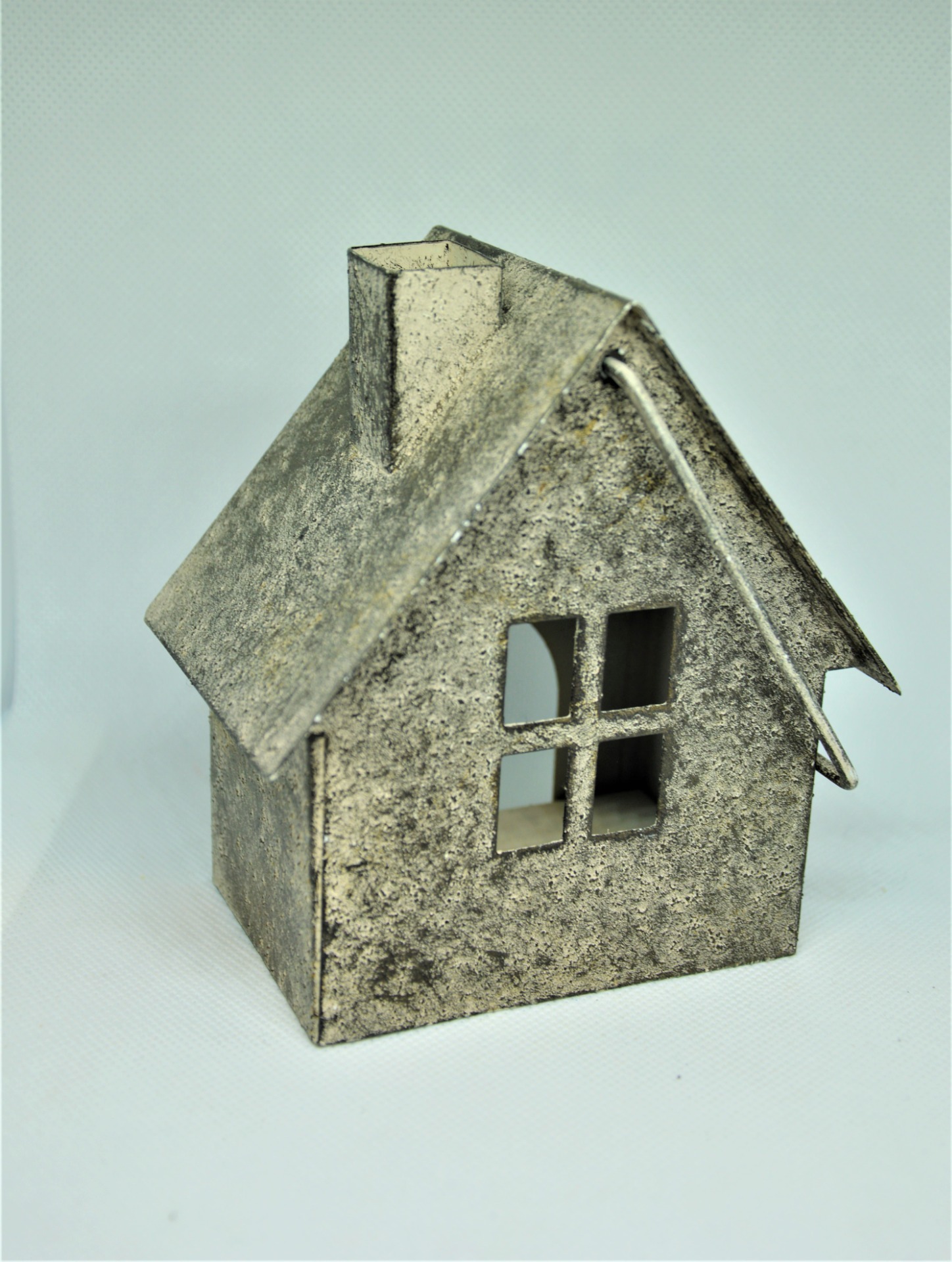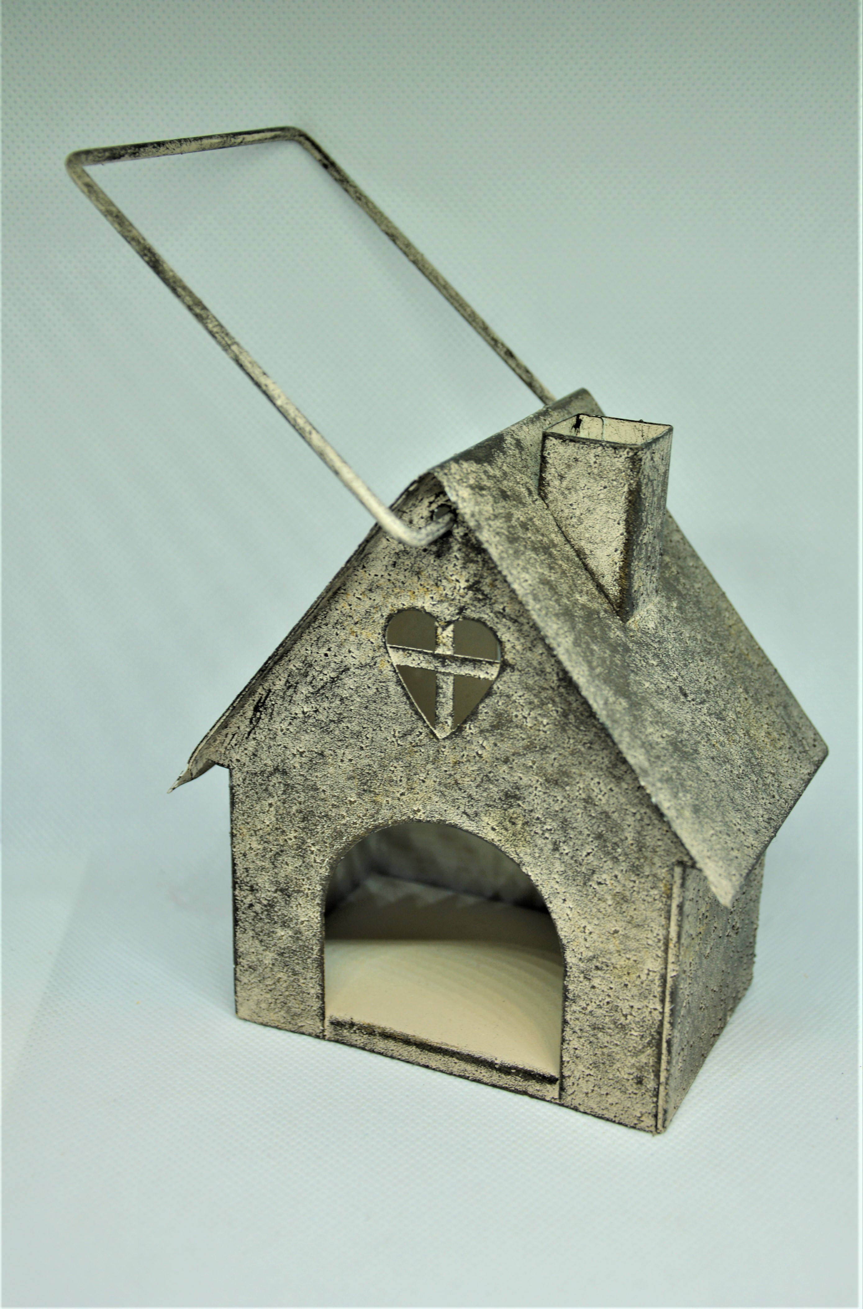 Plechový stojan na čajovou svíčku ve tvaru domečku s uchem na zavěšení - tmavošedý.