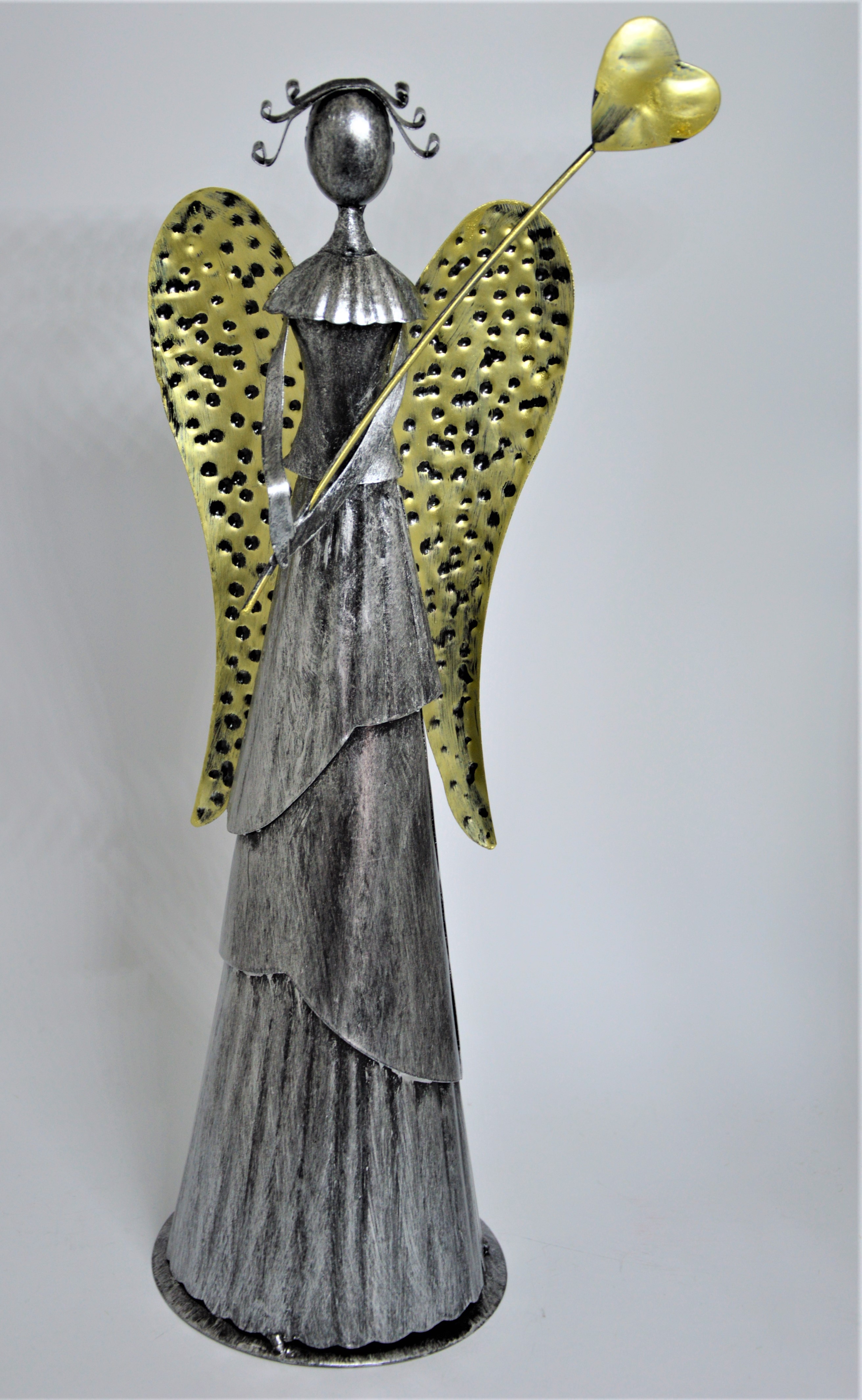 Plechový stříbrný anděl – krásný kovový anděl s nepřehlédnutelnými křídly a držící v ruce srdíčko.