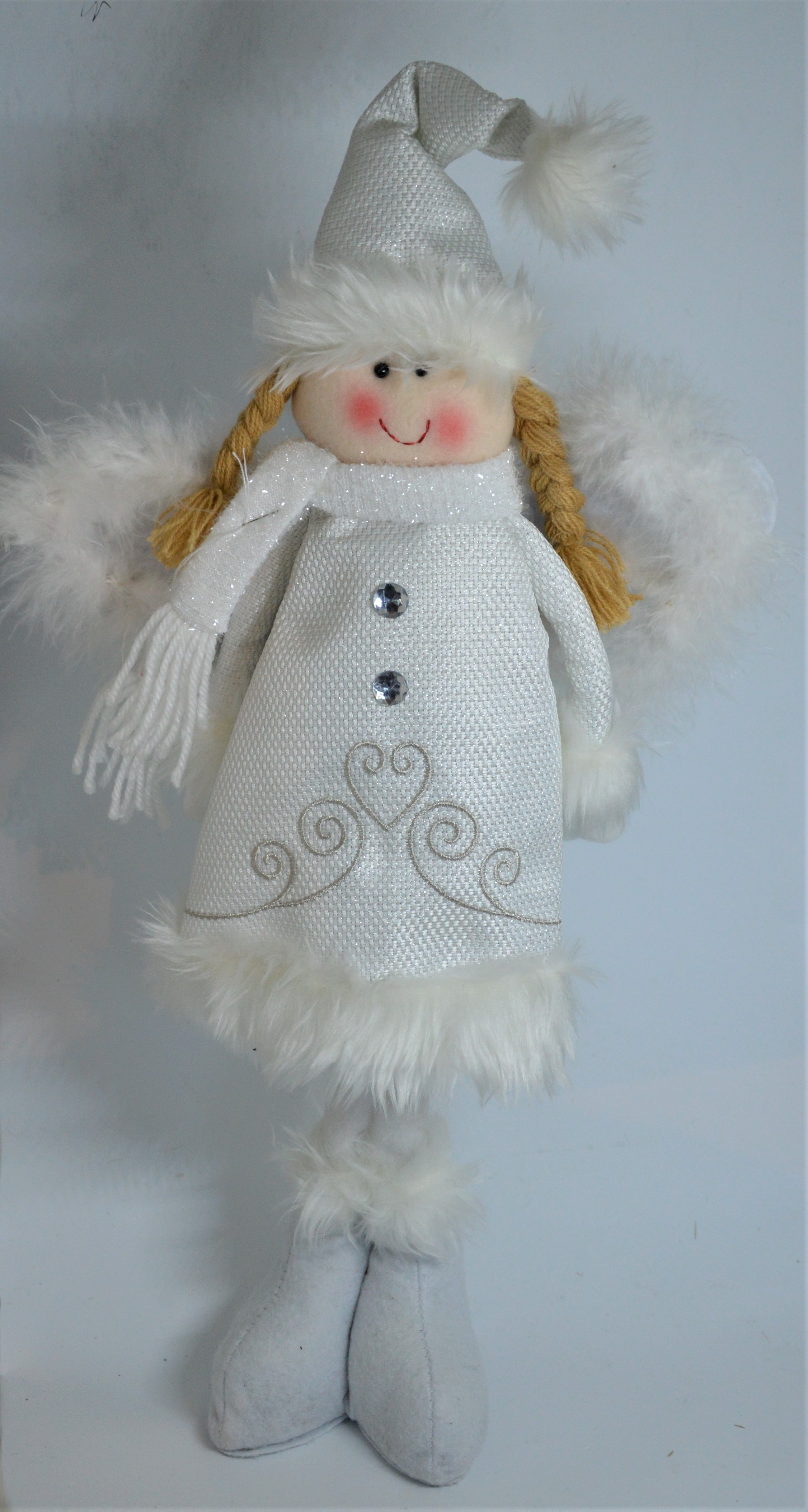 Plyšový andílek/panenka – vysoký roztomilý plyšový andílek/panenka stojí na nožkách a je oblečena do bílého zimního kabátku.