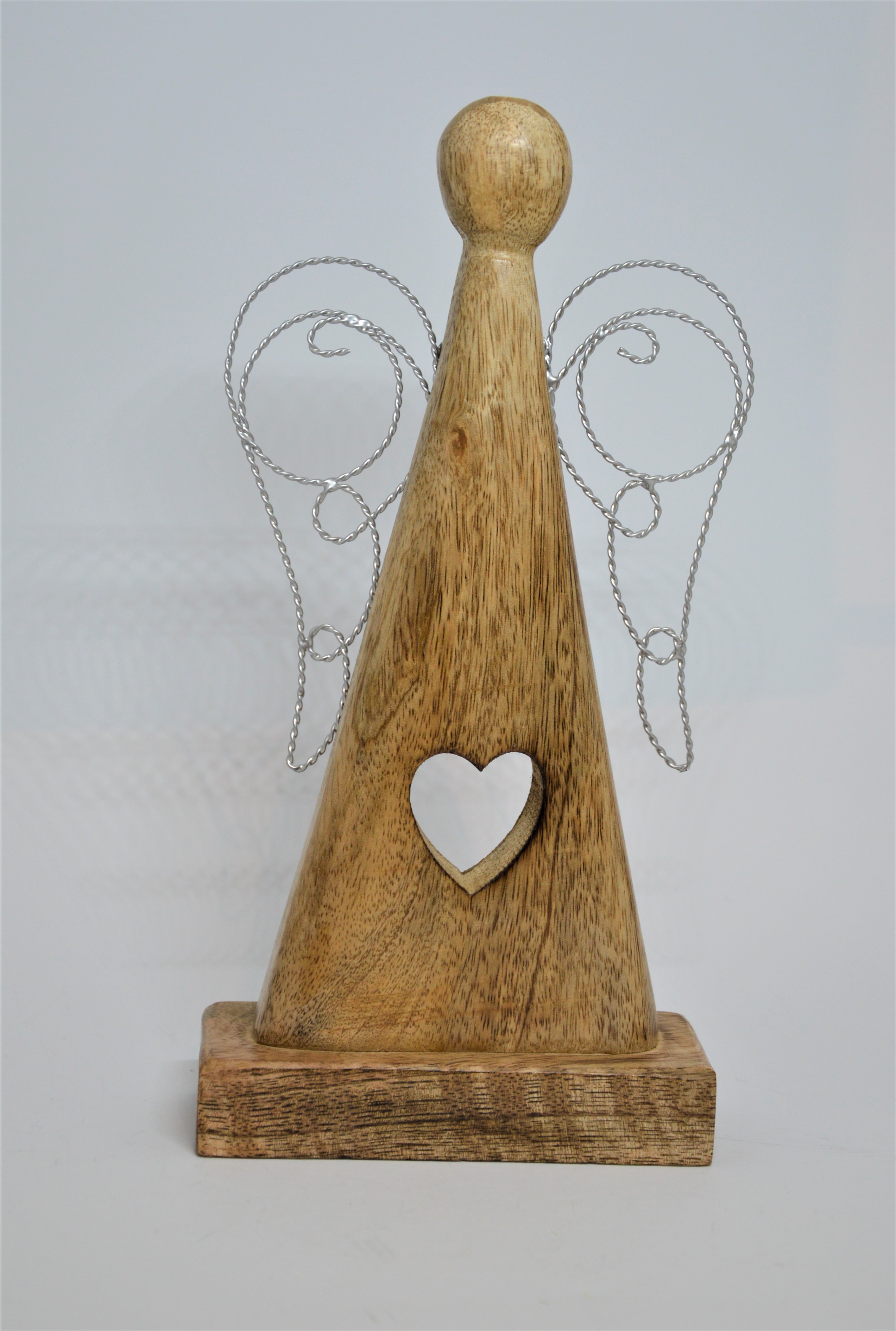 Přírodní anděl s drátěnými křídly – s vyřezávaným srdíčkem, umístěný na podstavci pro lepší stabilitu.