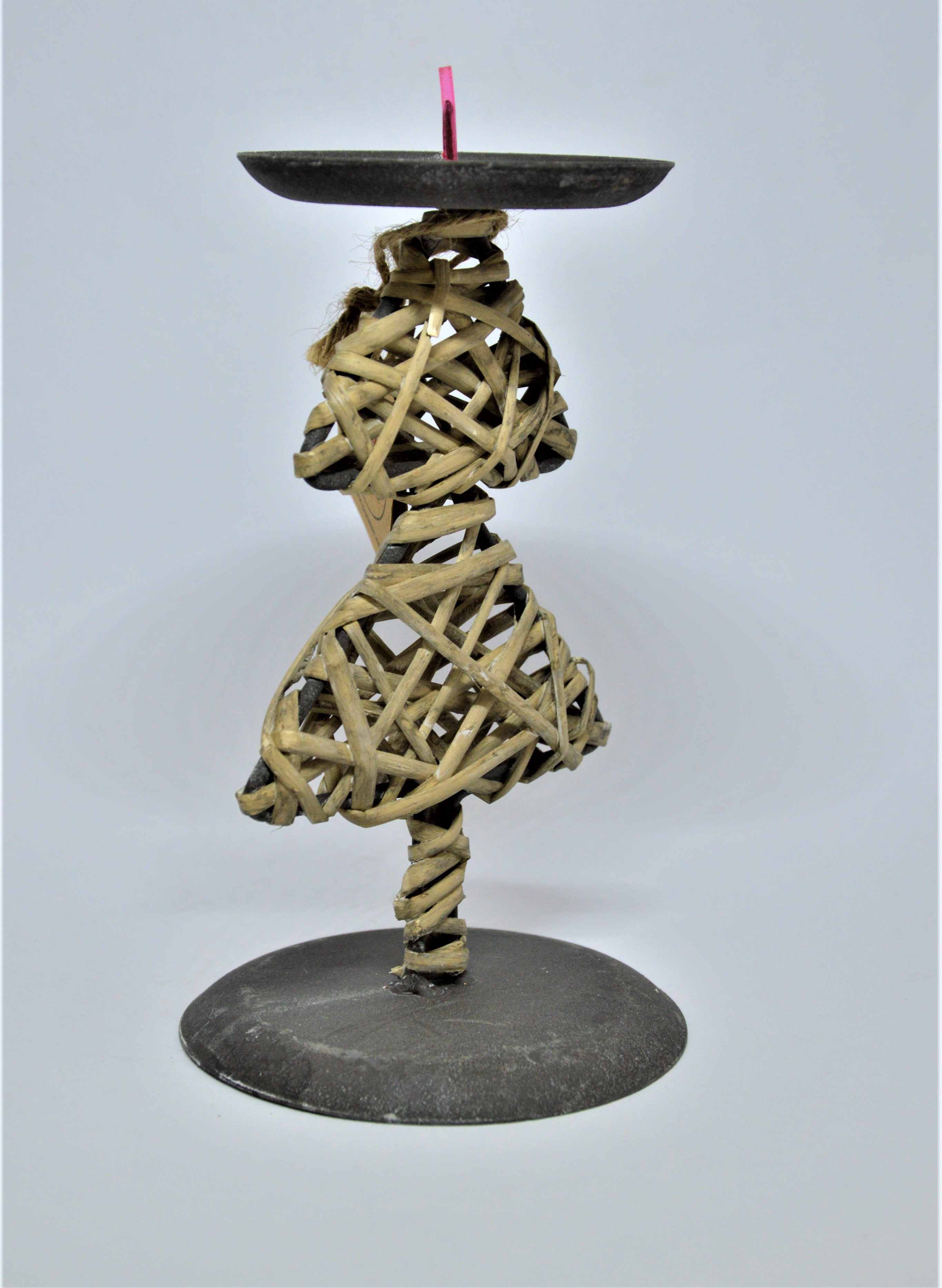 Proutěný vánoční stromeček - kovový svícen na svíčku ve tvaru stromečku z barveného proutí, který je umístěný na kovovém podstavci.