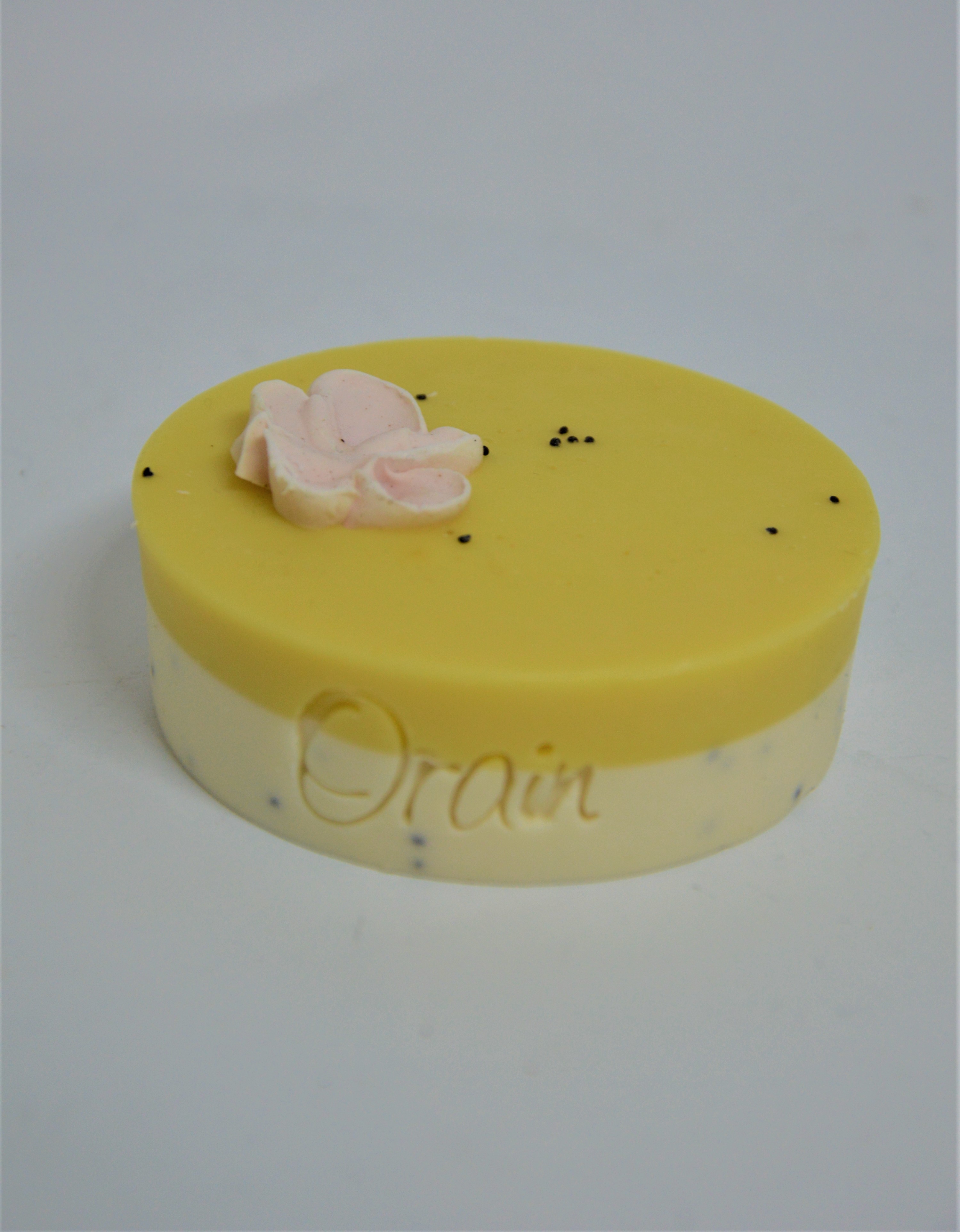 Žlutobílé kulaté mýdlo s květinou – originální mýdlo, které na první pohled zaujme svým netradičním designem. Žlutou mýdlovou hmotu zdobí nejen květina, ale i mák.