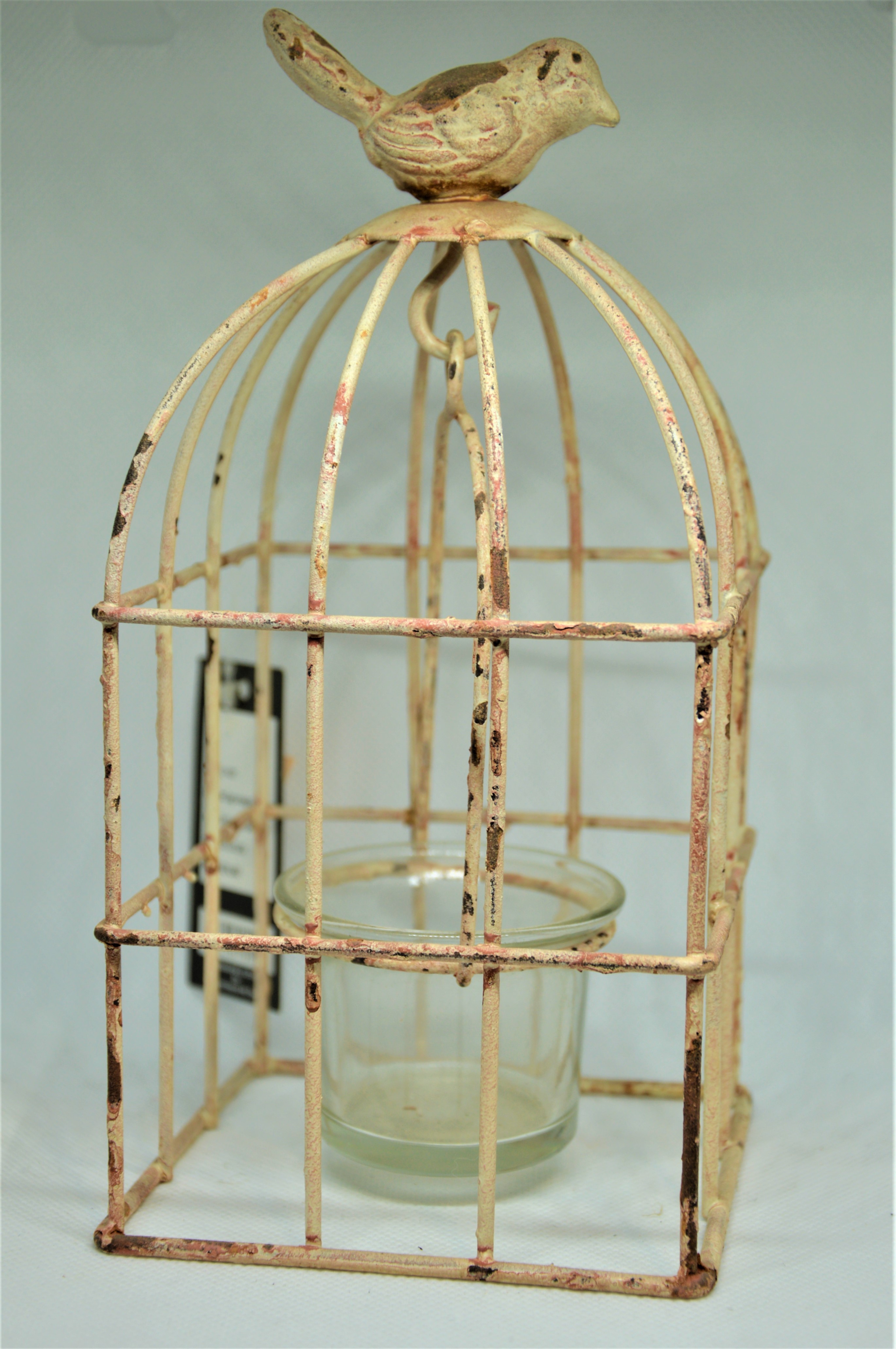Růžová kovová klec s ptáčkem na čajovou svíčku. Originální dekorace do interiéru, ale i do zahrady nebo na terasu.