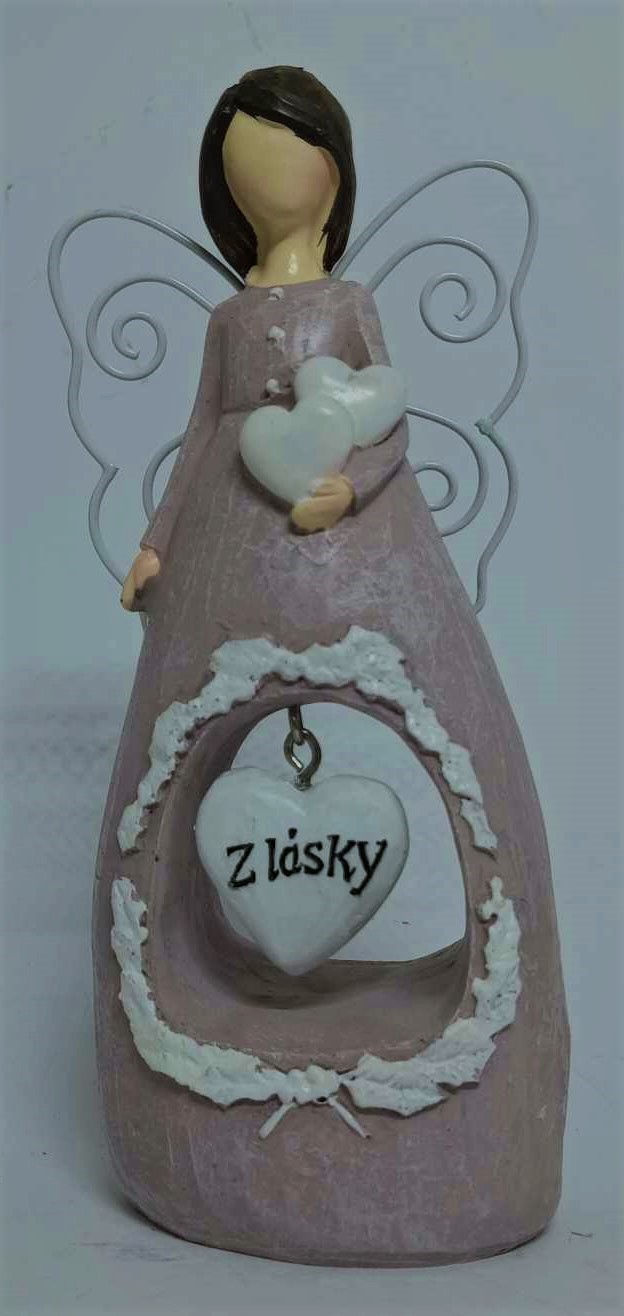Růžový andílek se srdíčky – půvabný růžový andělíček s krátkými hnědými vlásky a jemnými bílými křídly. Šaty zdobí visící srdíčko s nápisem Z lásky. V ruce drží další dvě bílá srdíčka.