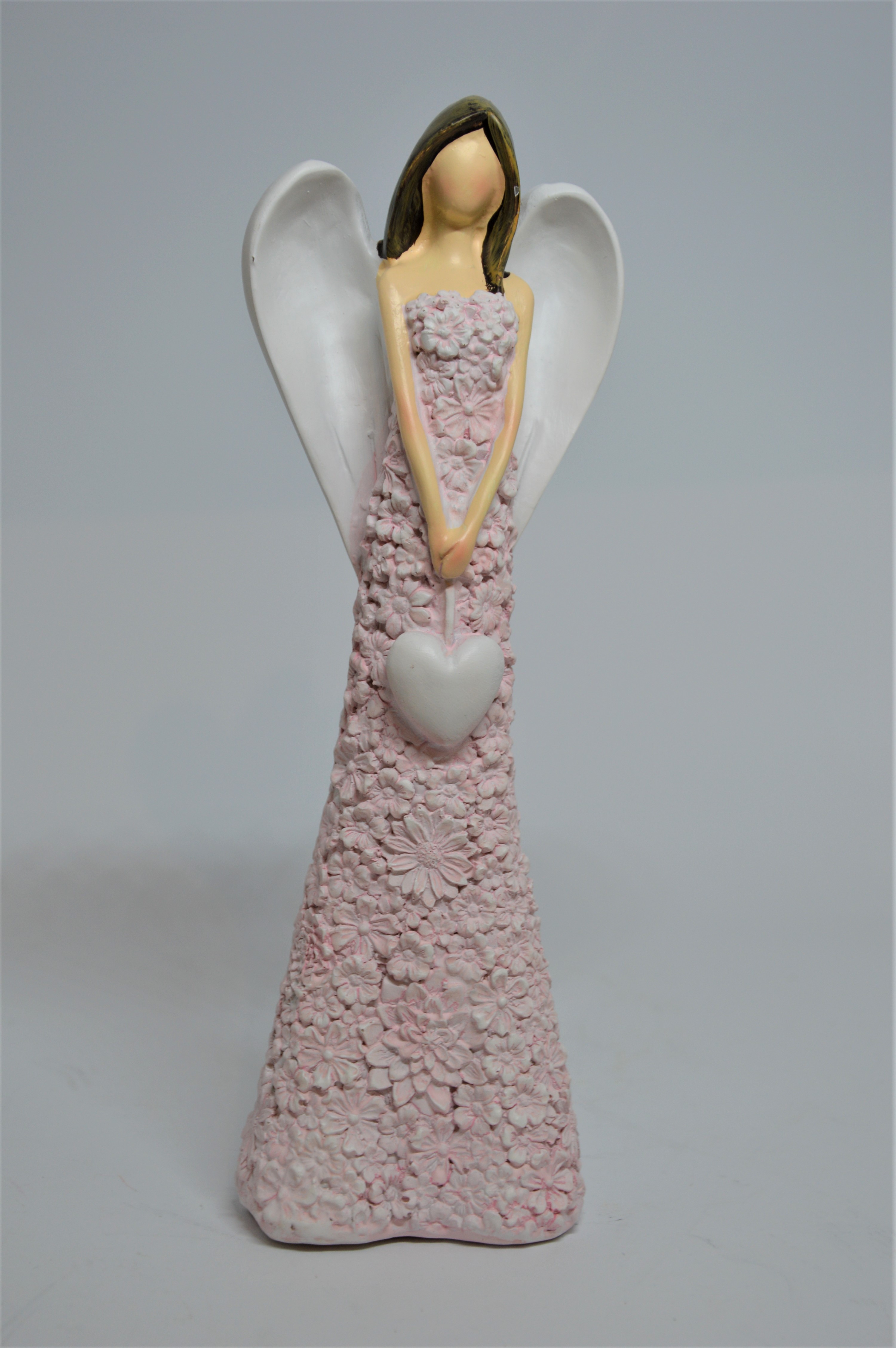 Růžový květinový anděl – bílá hladká křídla do tvaru srdce, šaty zdobené drobnými kvítky, tmavé vlásky dlouhé po ramena, nezřetelný obličej.