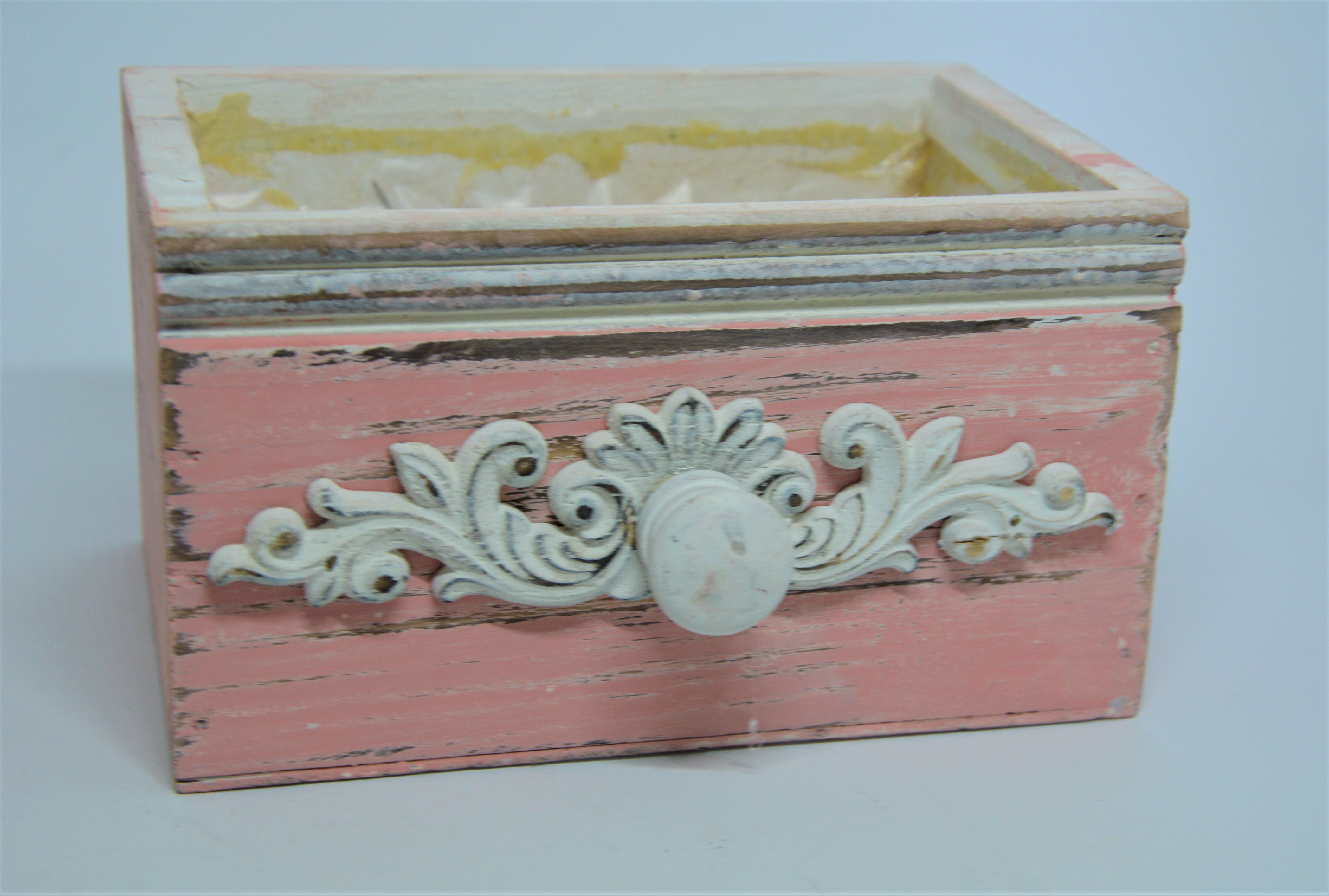 Růžový obal na květiny šuplík – dřevěný obal na květiny ve tvaru šuplíku v jemně pastelové růžové barvě, kterou doplňuje bílé zdobení.