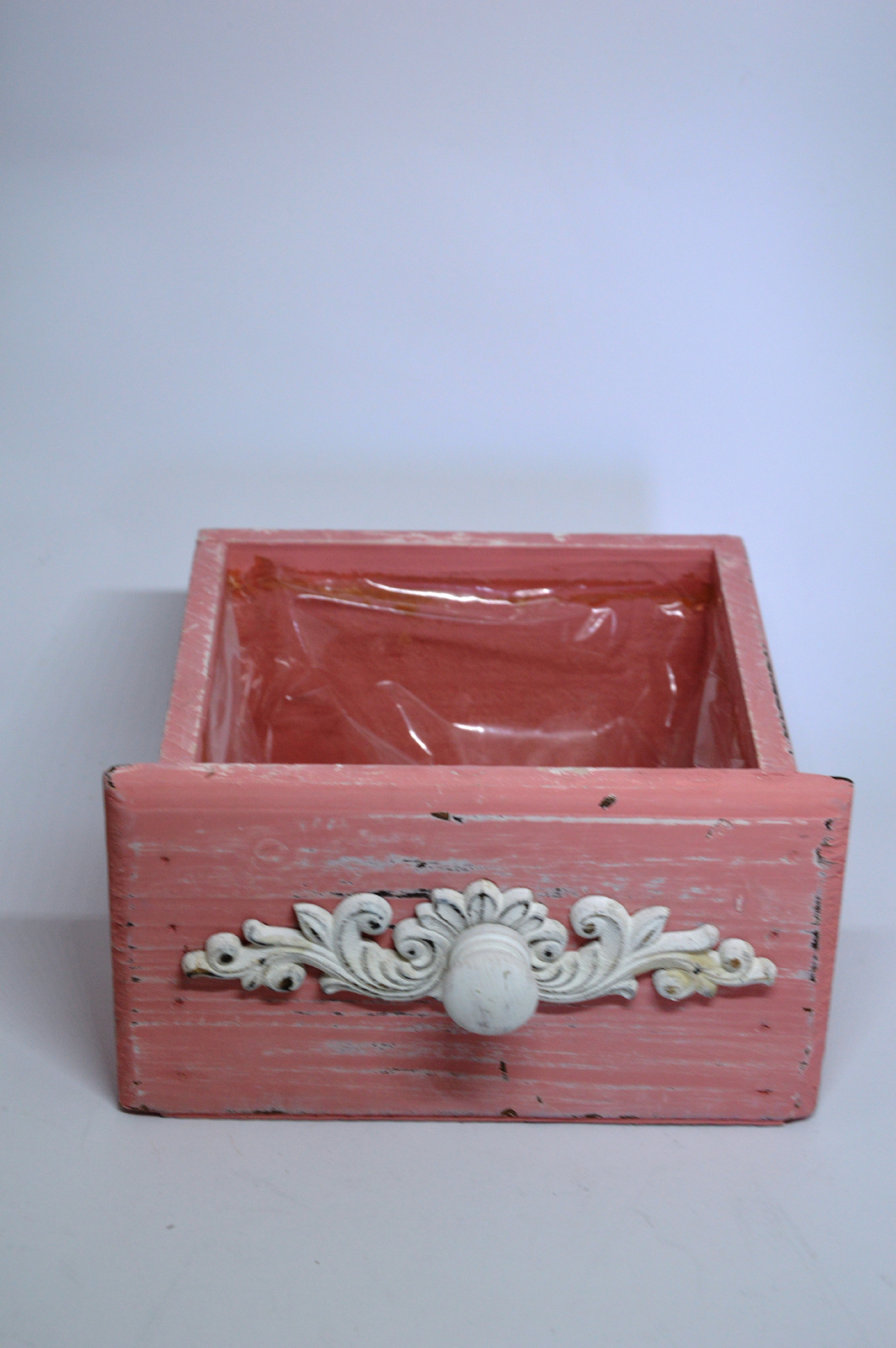Růžový obal na květiny šuplík – dřevěný obal na květiny ve tvaru šuplíku v jemně pastelové růžové barvě, kterou doplňuje bílé zdobení.