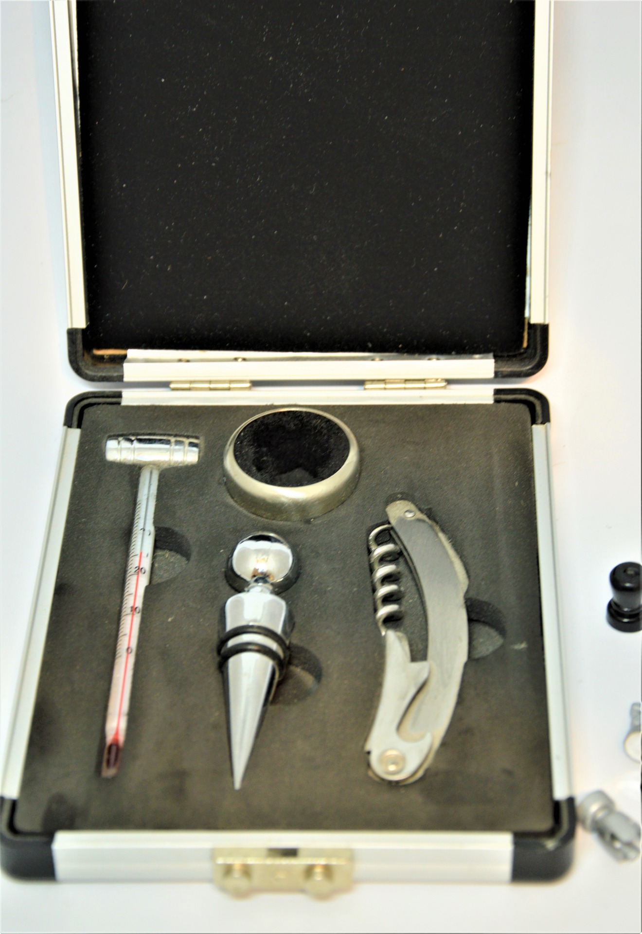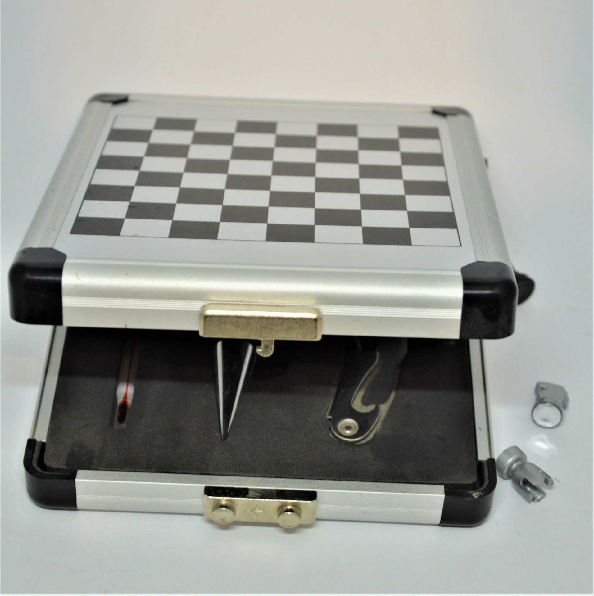 Sada na víno Šachy - ve stříbrné barvě. Originální a praktický dárek potěší nejen všechny milovníky dobrého vína, ale i všechny vášnivé šachisty. Obsahuje kompletní sadu doplňků na víno - teploměr, kroužek na hrdlo lahve, vývrtku, zátku.