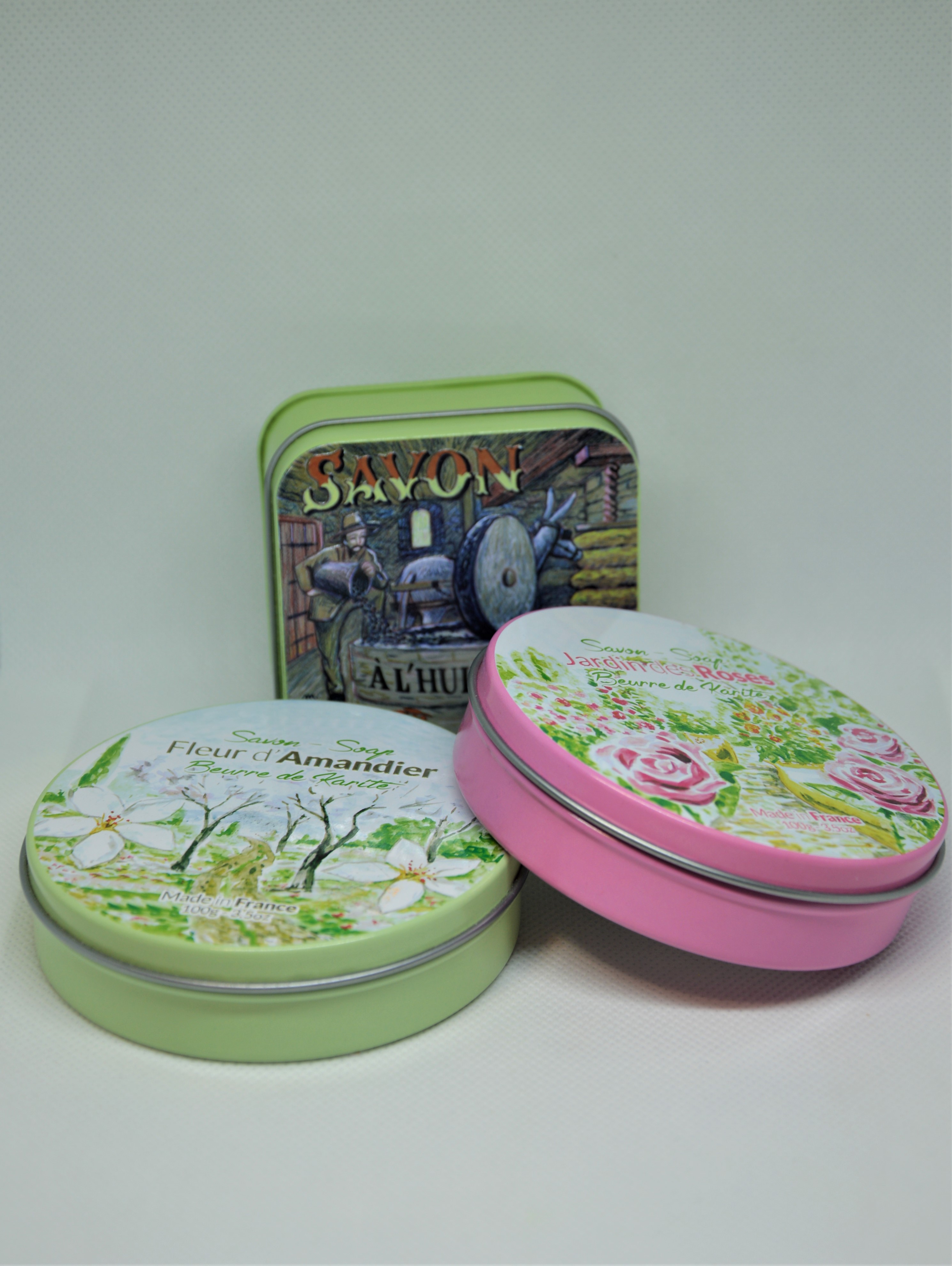 Francouzské luxusní přírodní mýdlo v plechové krabičce je obohacené BIO bambuckým máslem.
