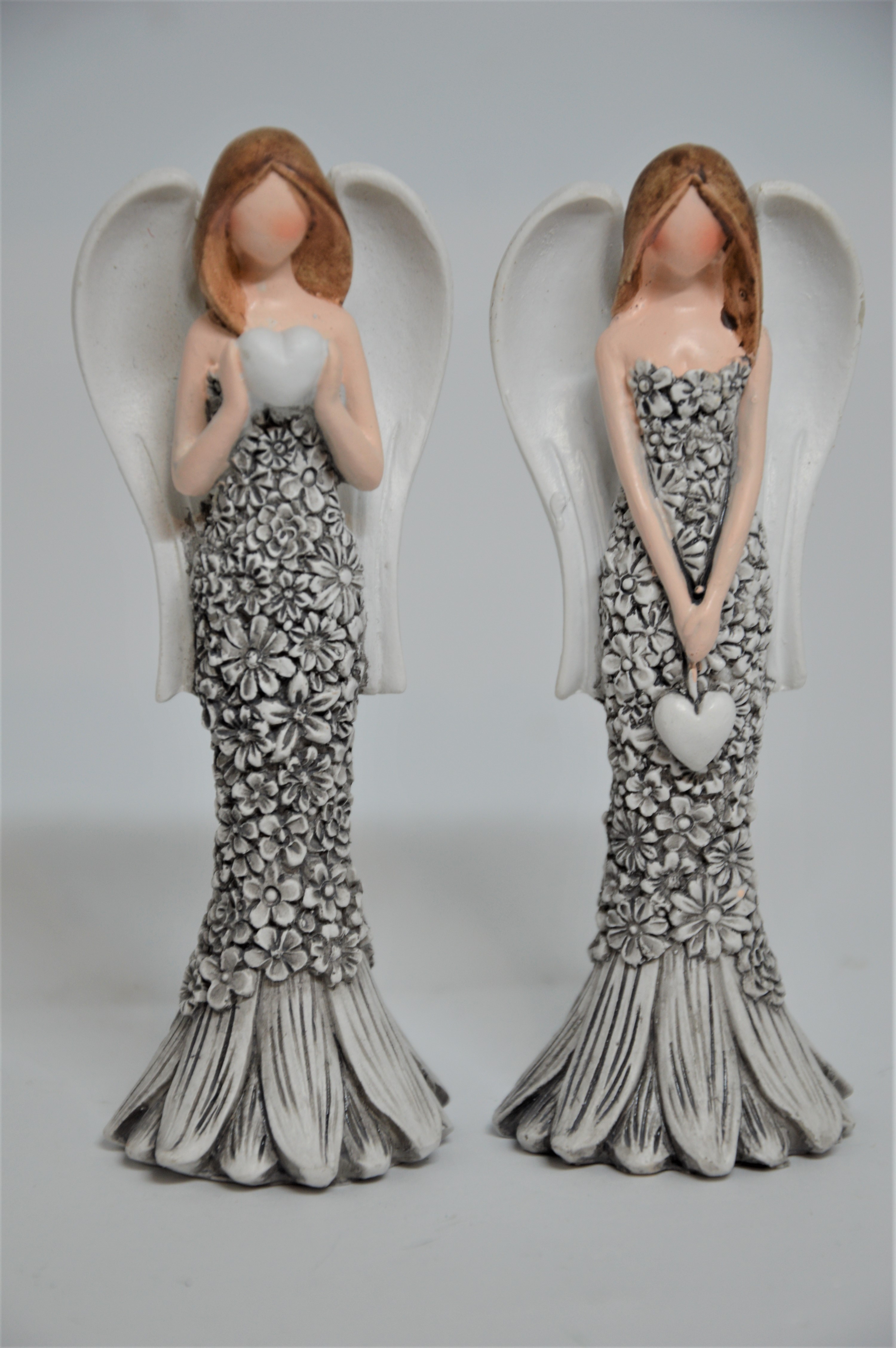 Šedobílý anděl – andílek v dlouhých šedých šatech s květinami, bílými křídly, delšími světlými vlásky a nezřetelným obličejem. V ruce drží srdíčko – symbol lásky.
