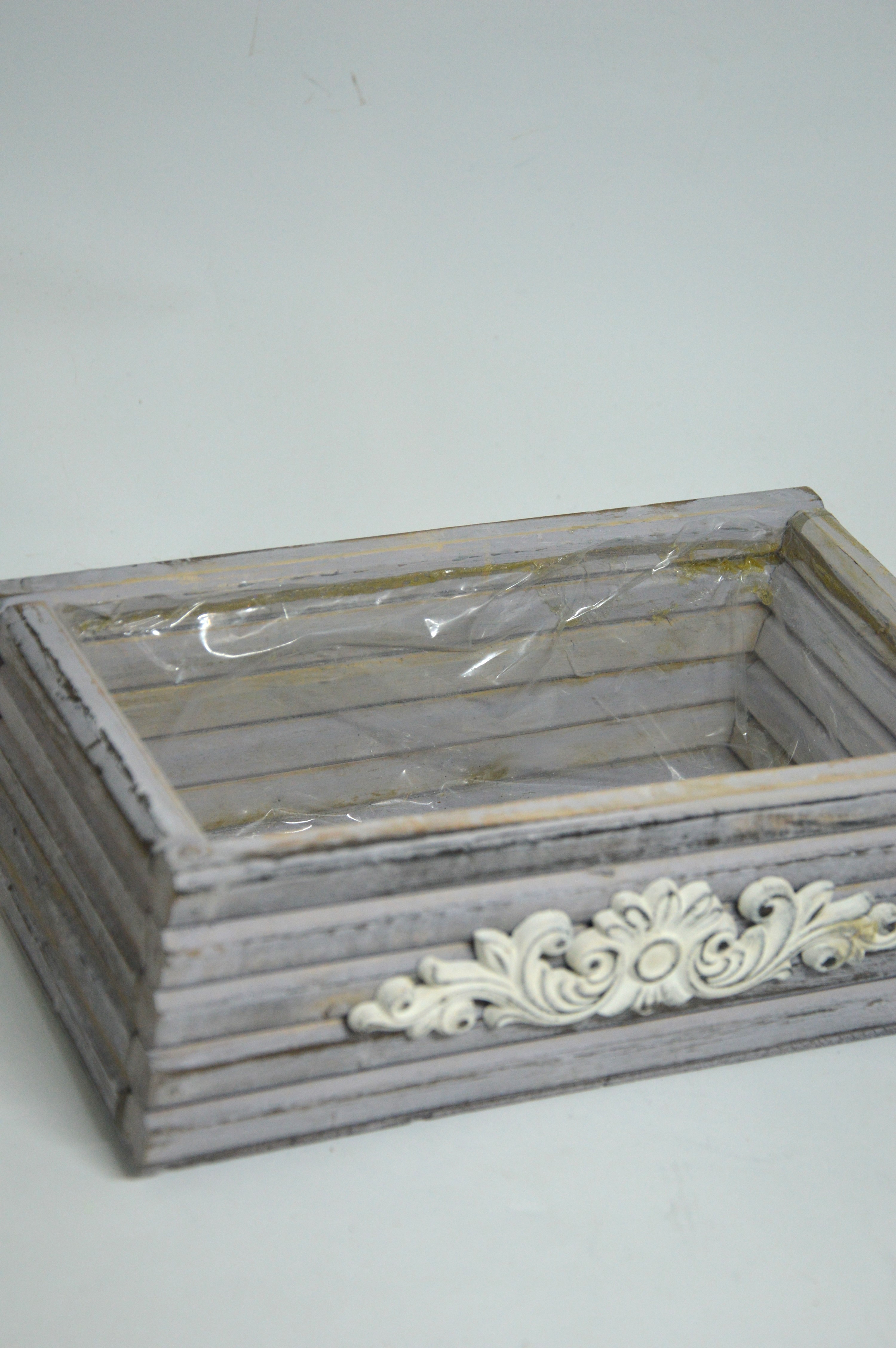 Šedý obal na květiny šuplík – dřevěný obal na květiny ve tvaru šuplíku v decentní šedé barvě, kterou doplňuje bílé zdobení.