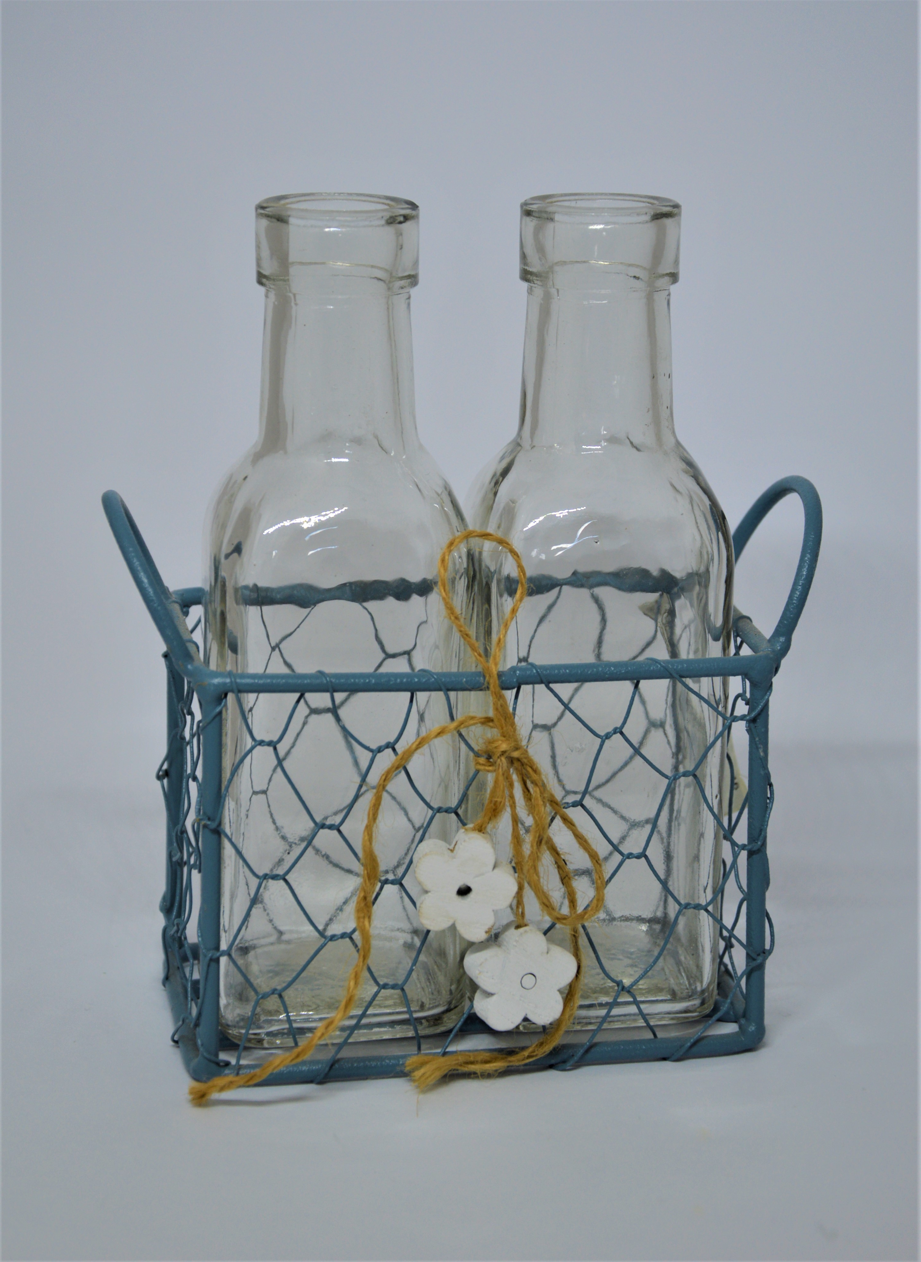 Skleněné vázičky v modrém košíku - dvě skleněné vázičky “usazené” v modrém kovovém košíku, který je ozdoben jutovým provázkem a bílými dřevěnými květinami. Krásná - nejen jarní - dekorace se bude skvěle vyjímat třeba na prostřeném stole.