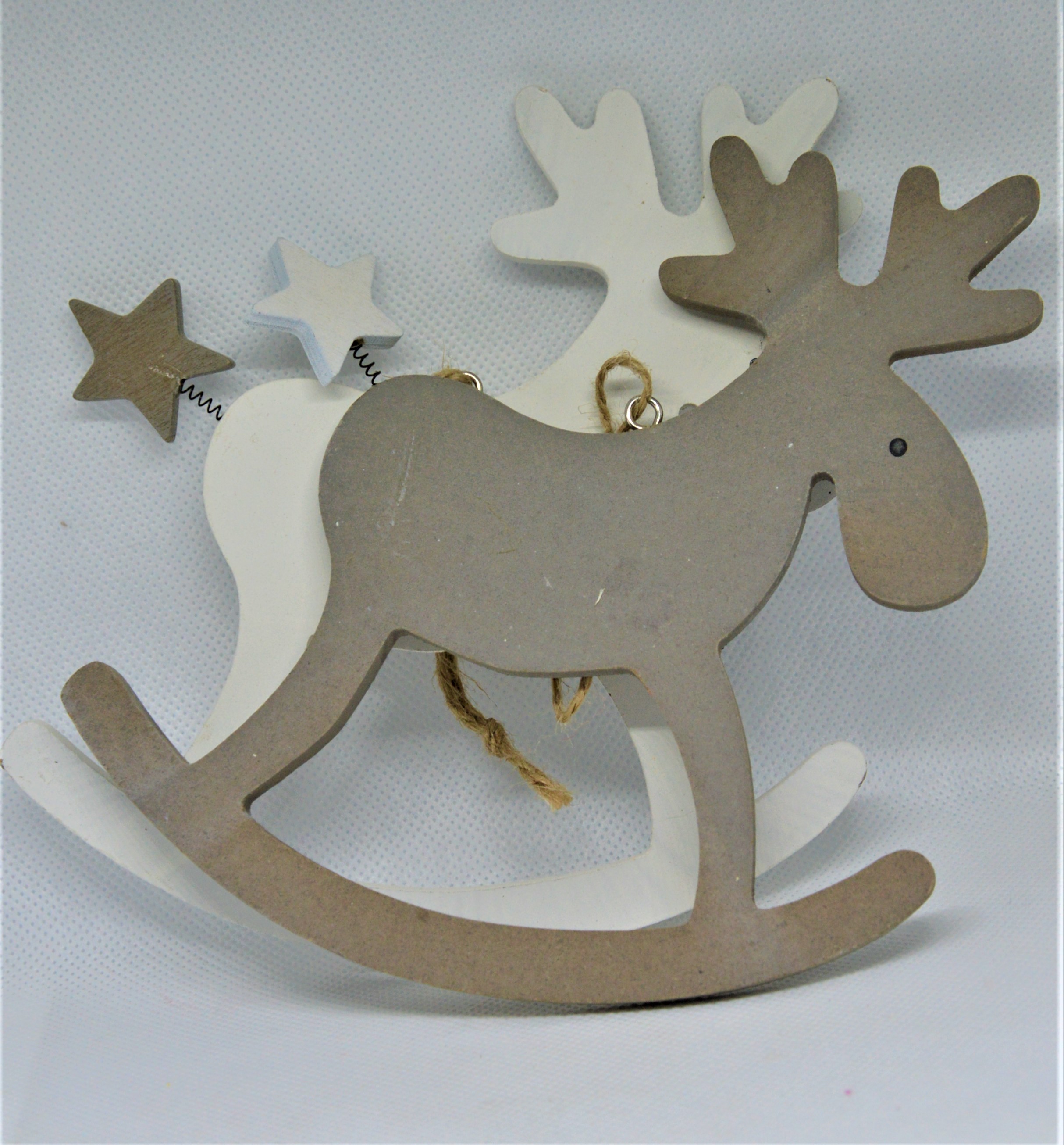 Sobík ze dřeva - krásná zimní a vánoční dekorace v podobě houpacího sobíka, který má místo ocásku hvězdičku na pérku.