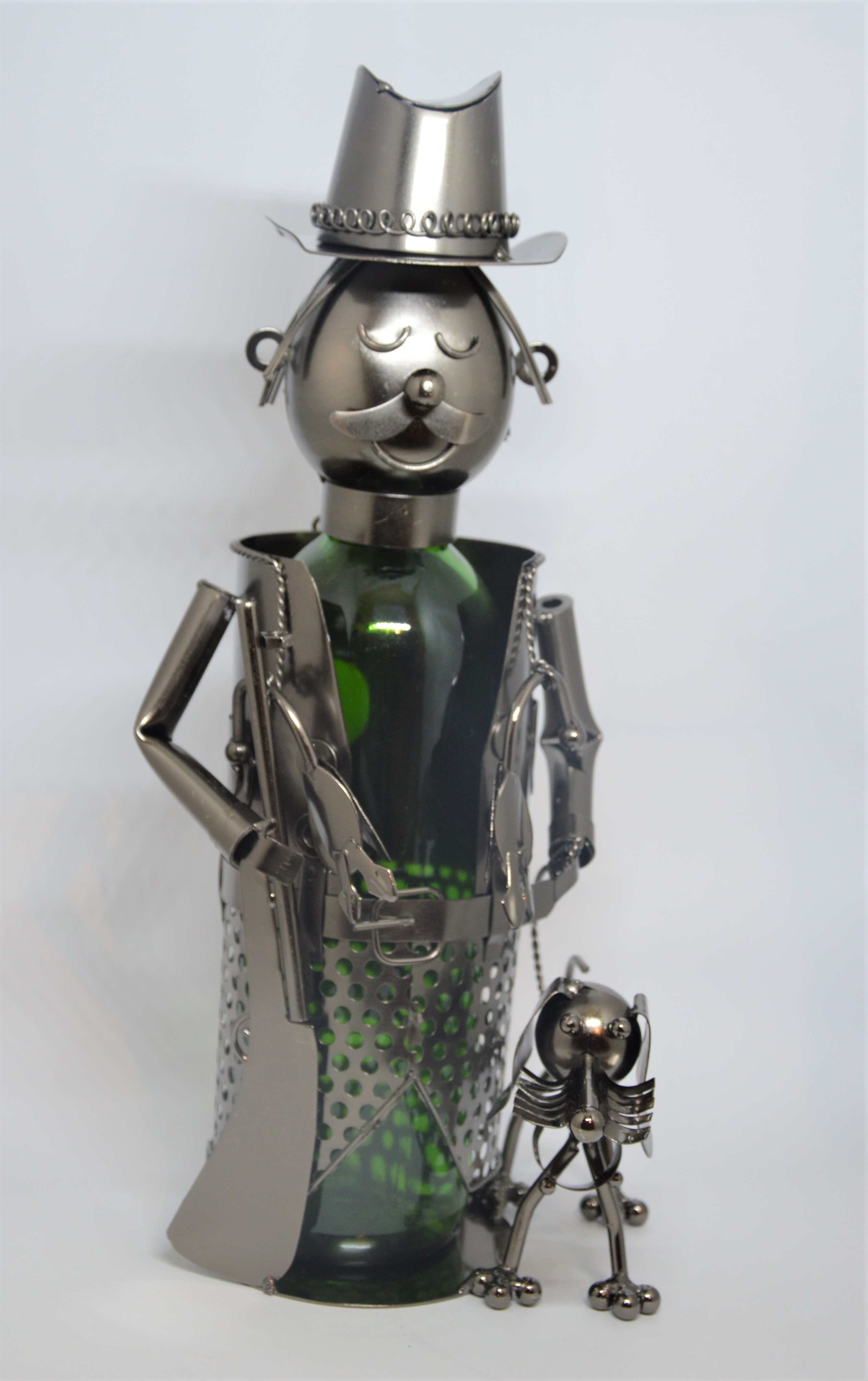 Stojan na víno Myslivec - originální kovový stojan na víno potěší jako tematický dárek všechny milovníky dobrého vína a příznivce myslivosti a lovu.