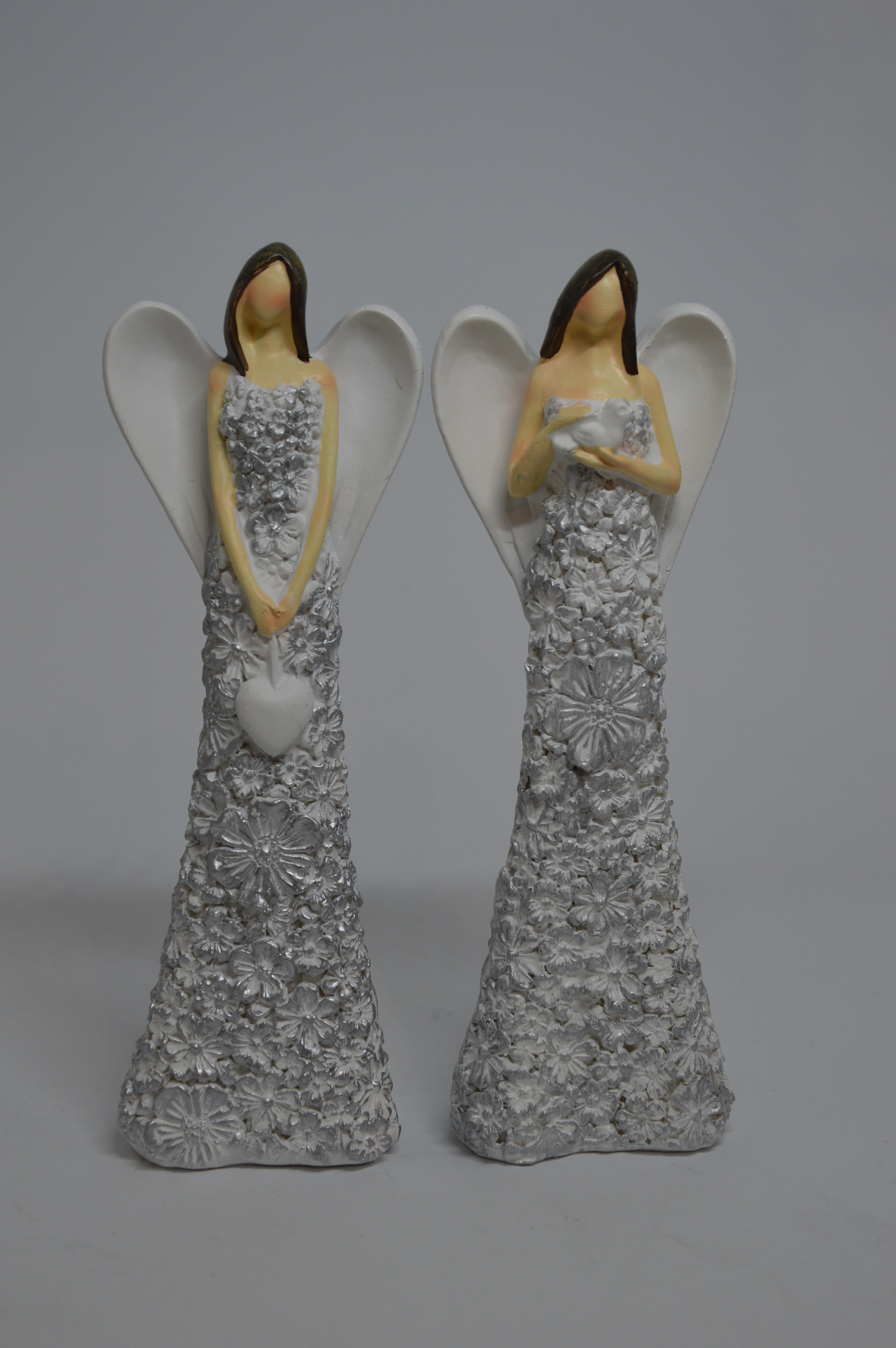Stříbrno-bílý květinový anděl – oblečený je do šatů z drobných květinek. Má dlouhé tmavé vlásky po ramena, nezřetelný obličej a bílá hladká křídla ve tvaru srdce.