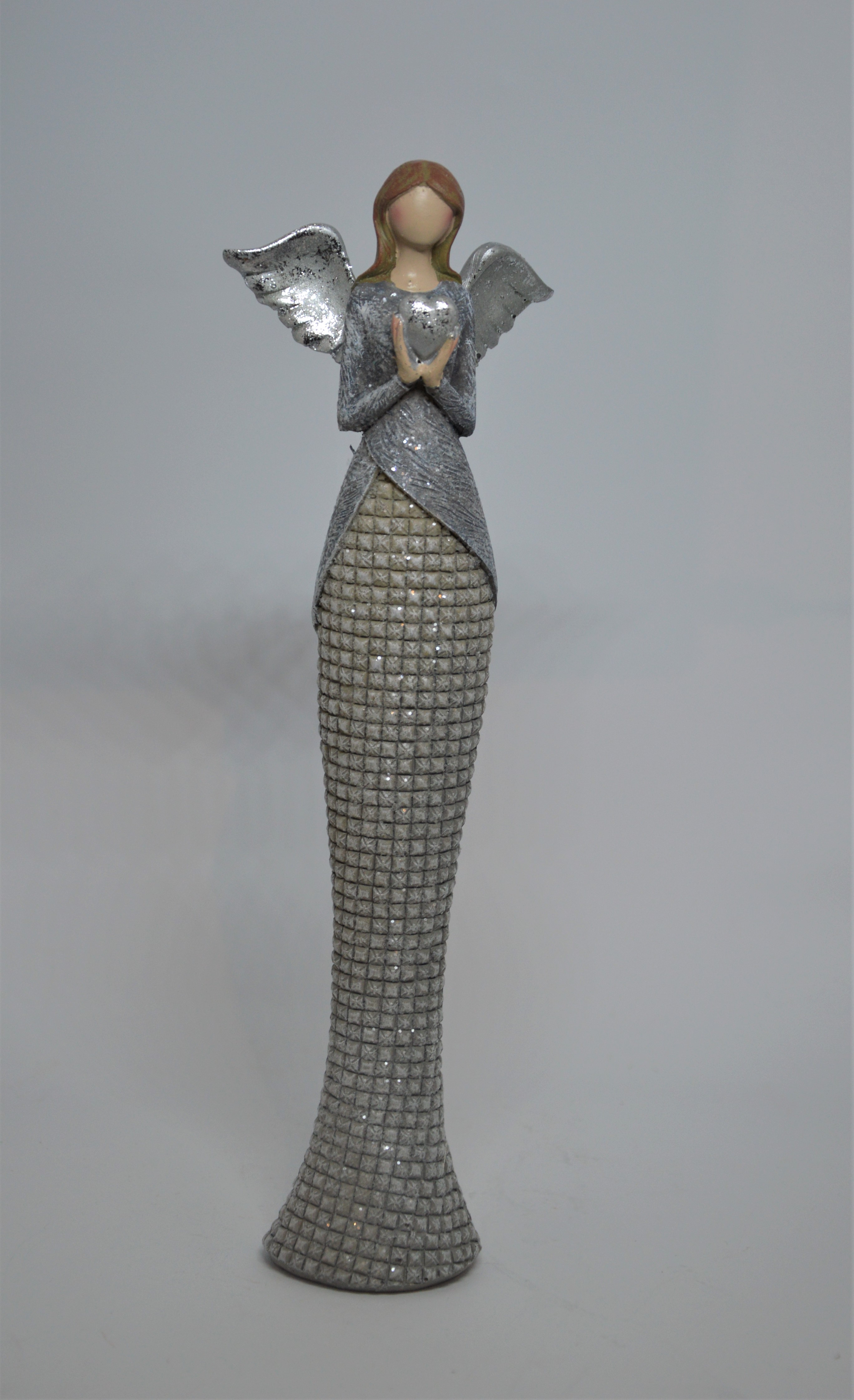 Má delší hnědé vlasy, nezřetelný obličej, jemná stříbrná křídla, oblečený je do atypicky řešených šatů. V rukách drží stříbrné srdíčko. Skvěle se tak hodí jako dárek z lásky pro vaše nejbližší.