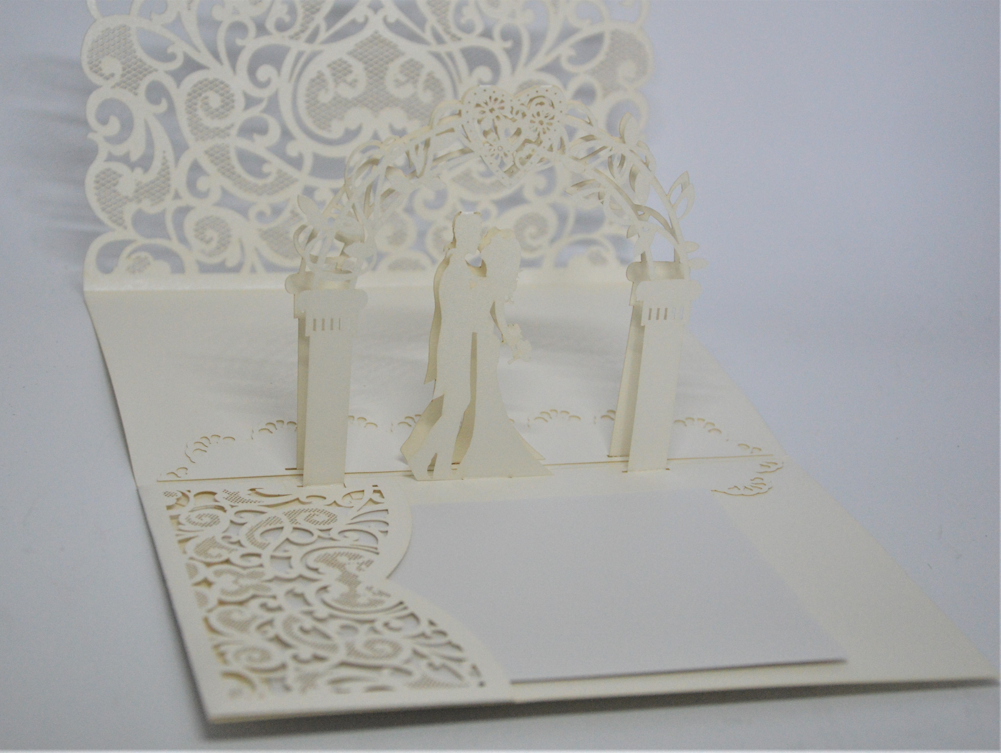 Nechcete-li, aby vaše přáníčko v záplavě ostatních zapadlo, sáhněte po tomto originálním 3D kousku v tradiční krémové barvě s motivem dvou zamilovaných pod svatební slavobránou.