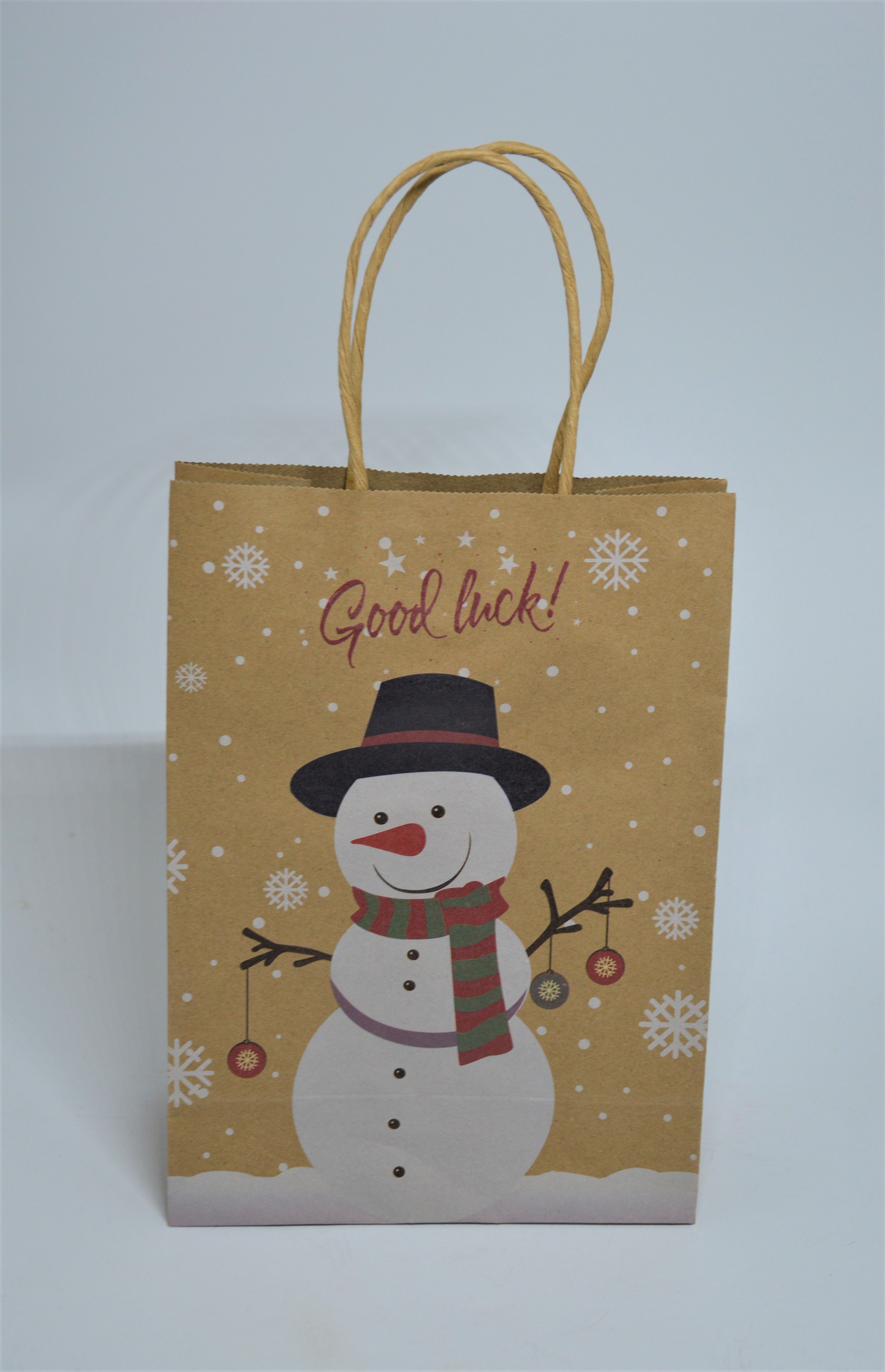 Dárková taška se sněhulákem - všem, kteří nechtějí ztrácet čas dlouhým balením dárků, se bude hodit tato kraftová papírová taška s motivem usměvavého sněhuláka a nápisem: Good luck!