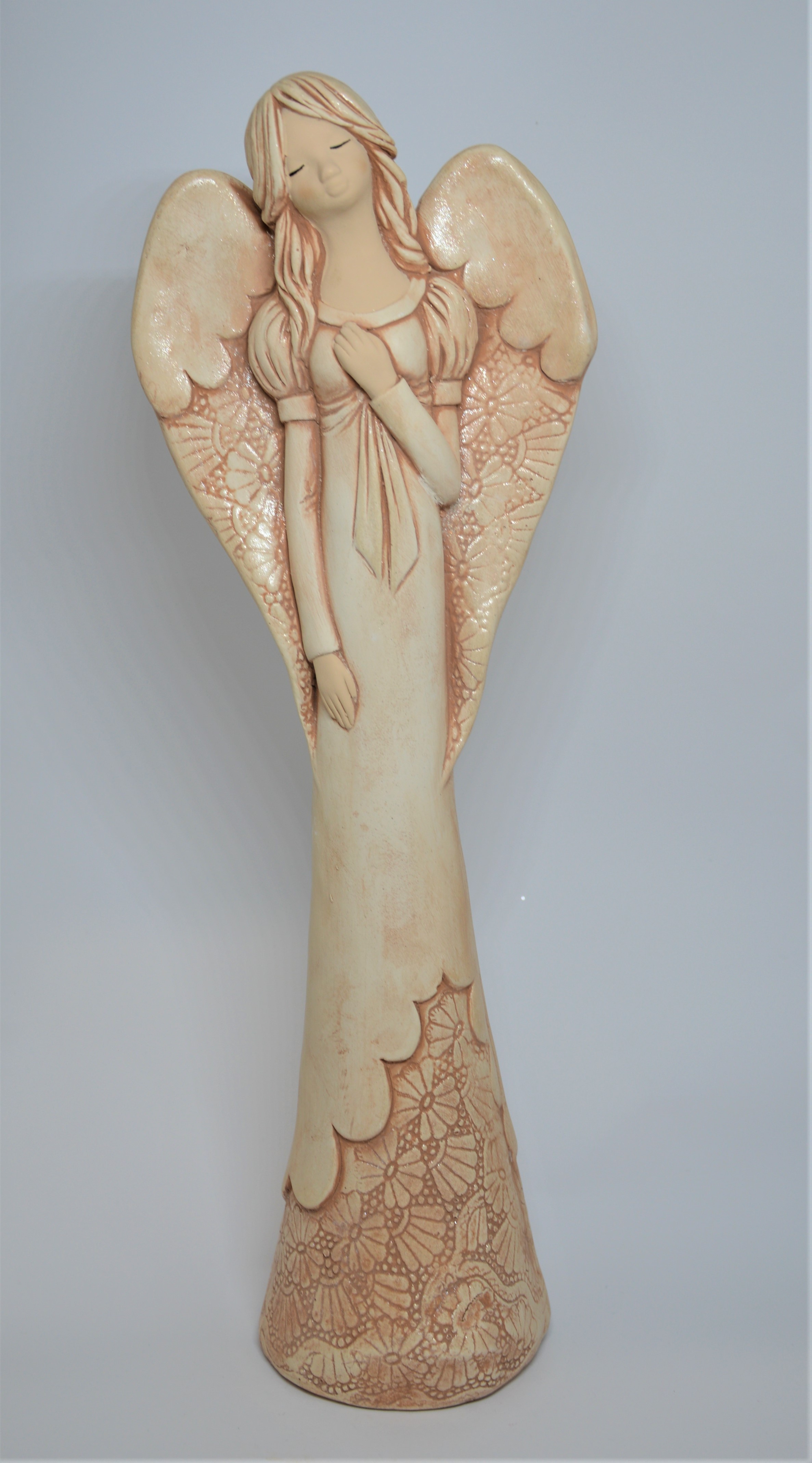 Sádrový anděl světle hnědý v netradičním provedení. Na první pohled vyniká originálně řešenými křídly a dlouhými úzkými šaty převázanými mašličkou, jež ve spodní části zdobí květiny.