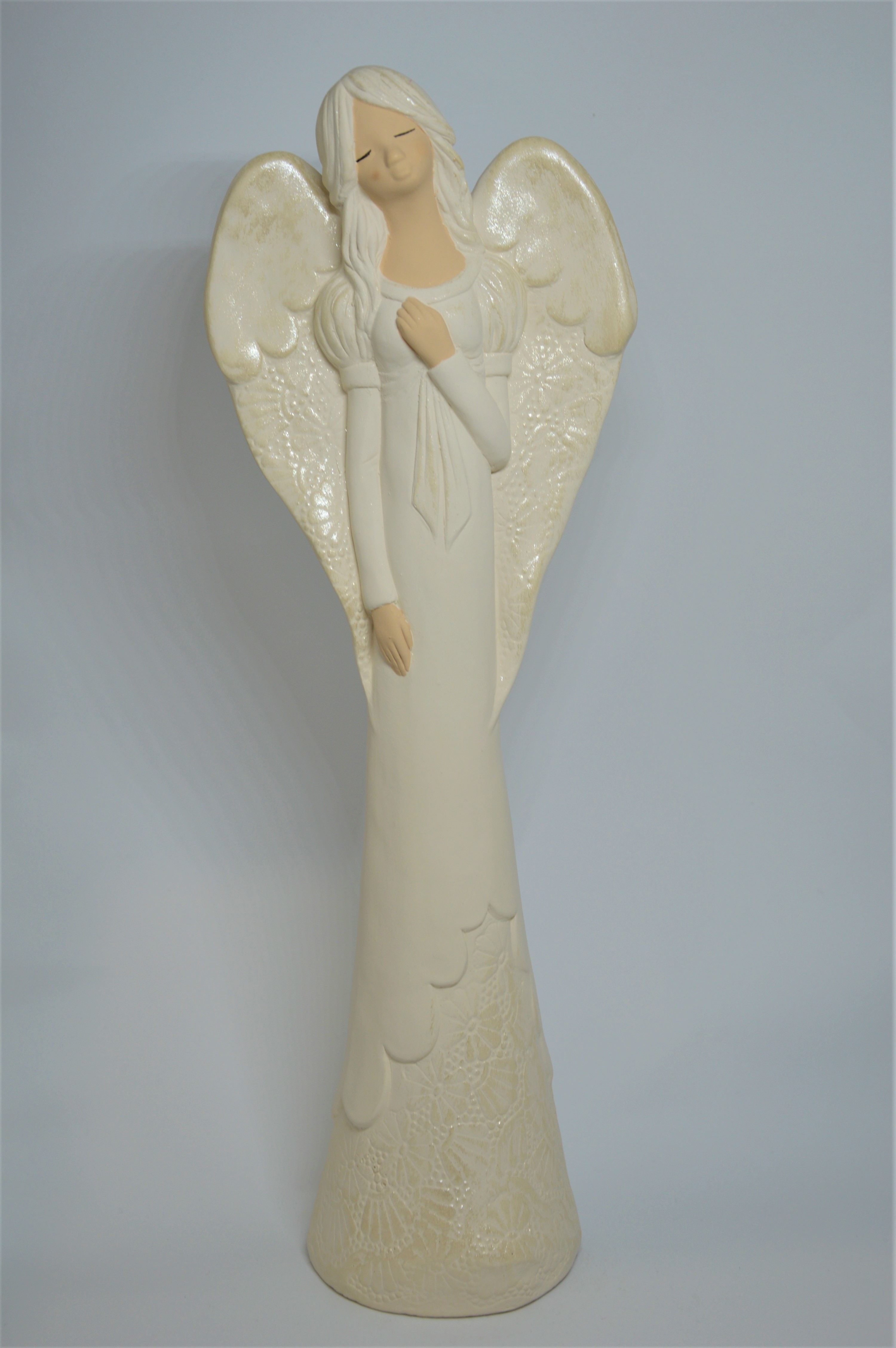 Světle hnědý sádrový anděl v netradičním provedení. Na první pohled vyniká originálně řešenými lesklými křídly a dlouhými úzkými šaty převázanými mašličkou, jež ve spodní části zdobí květiny.