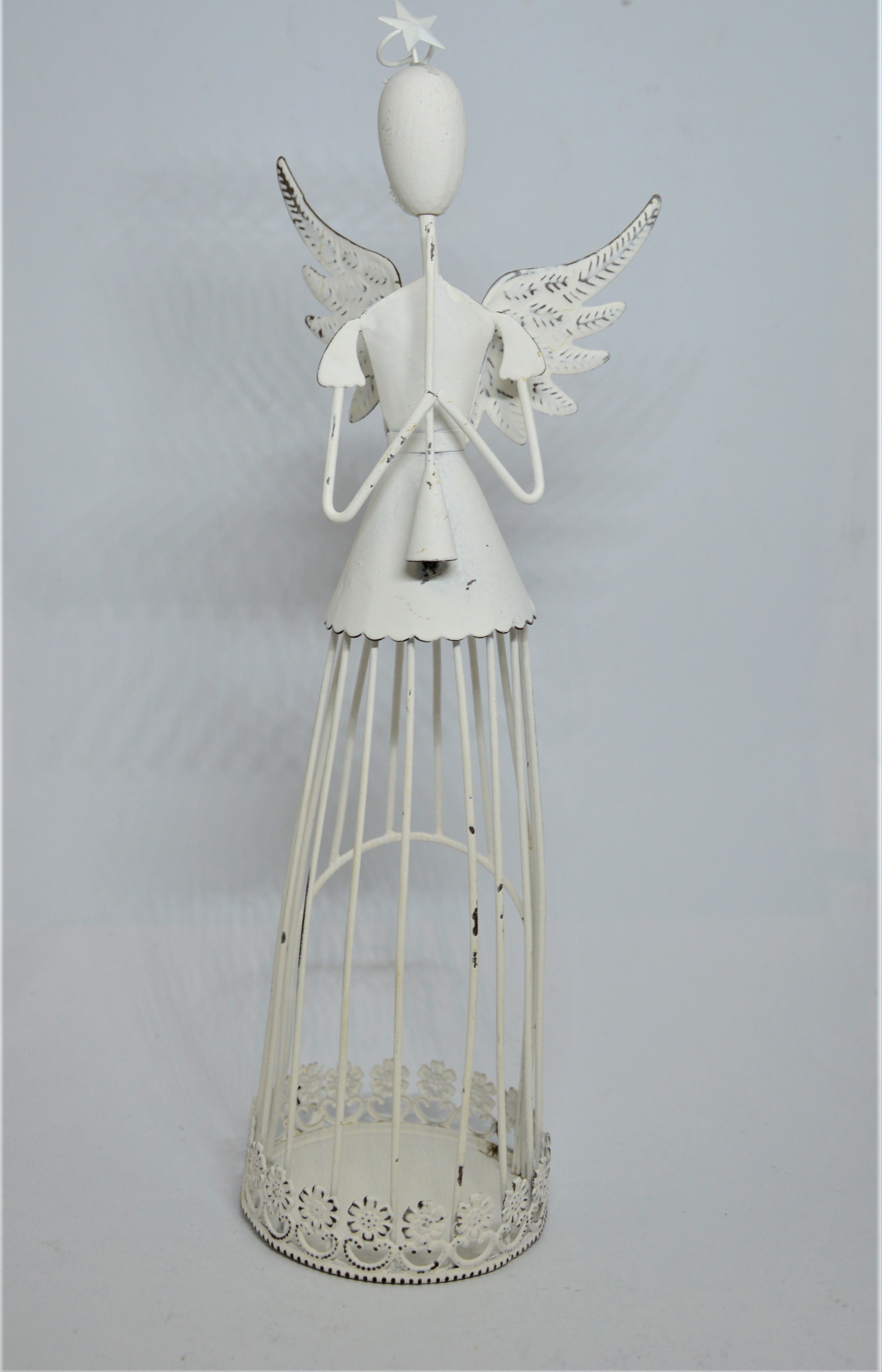 Svícen anděl - bílý dekorační kovový svícen na čajovou svíčku. Něžný design anděla se svatozáří, který hraje na trubku.