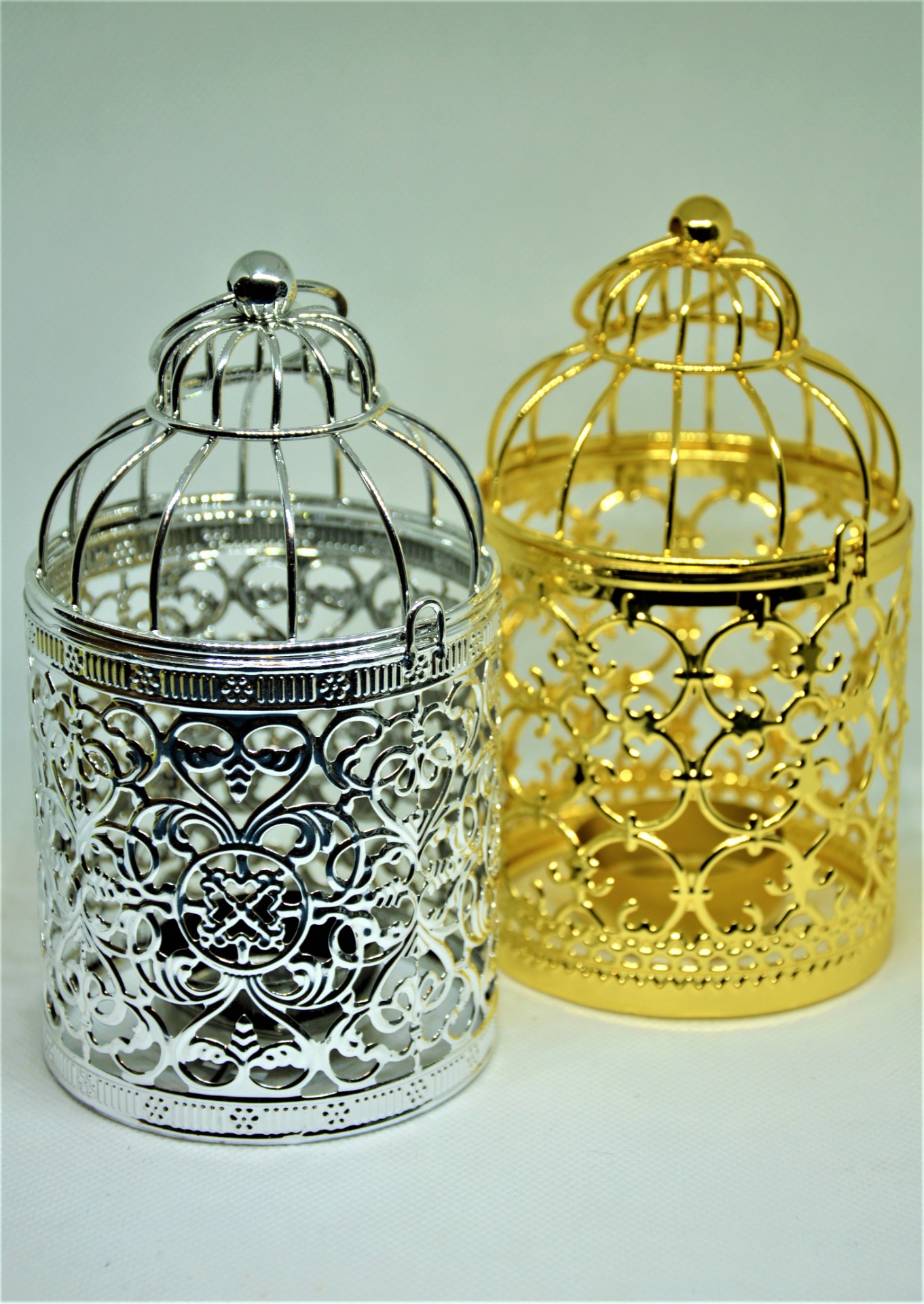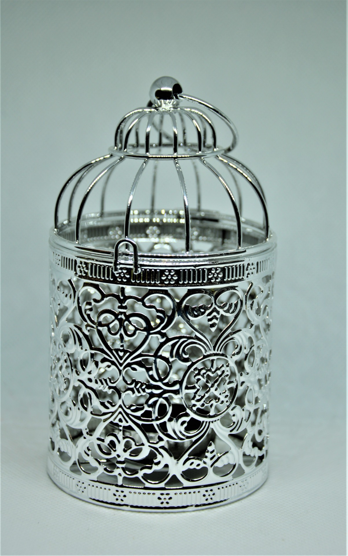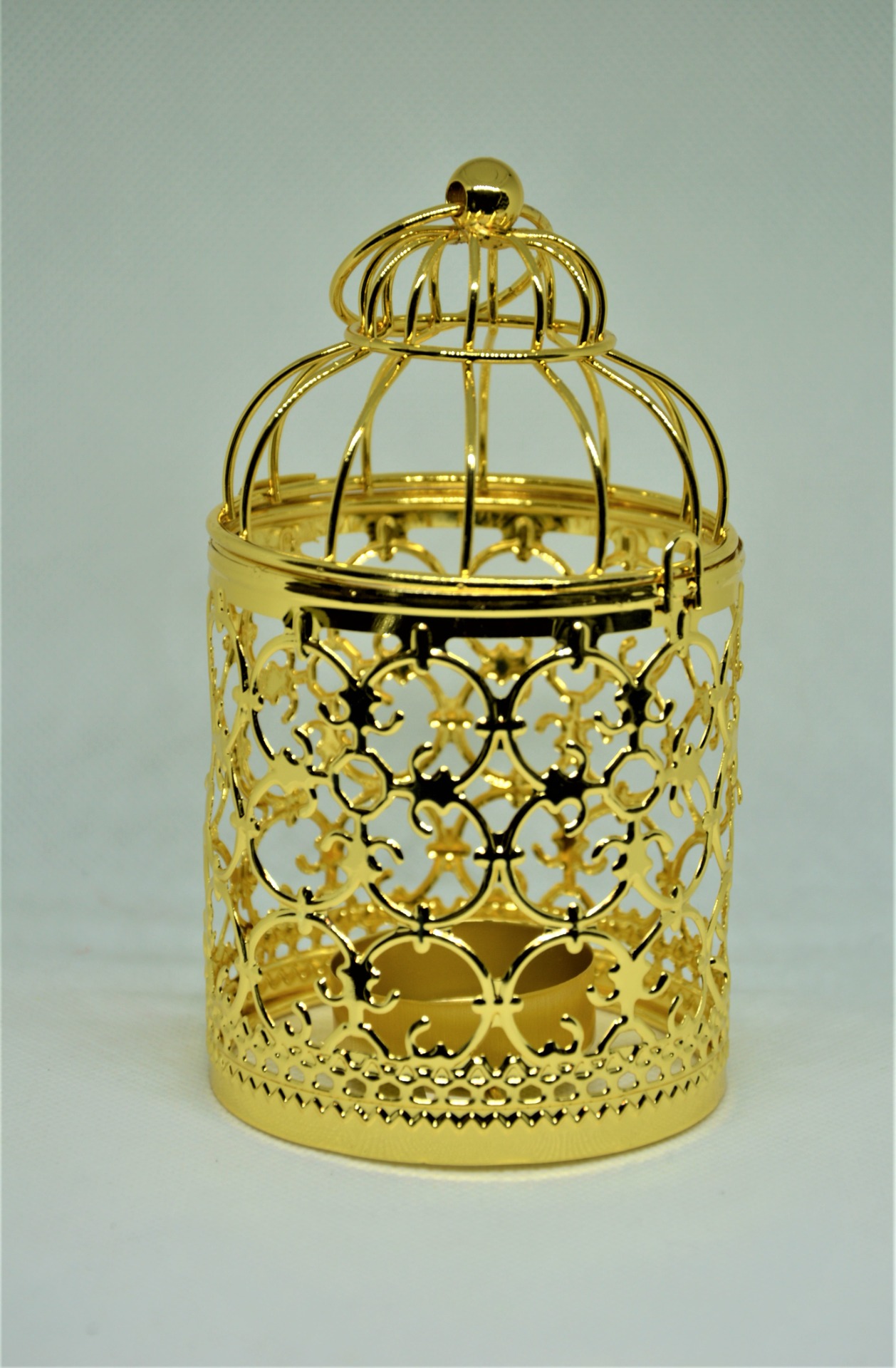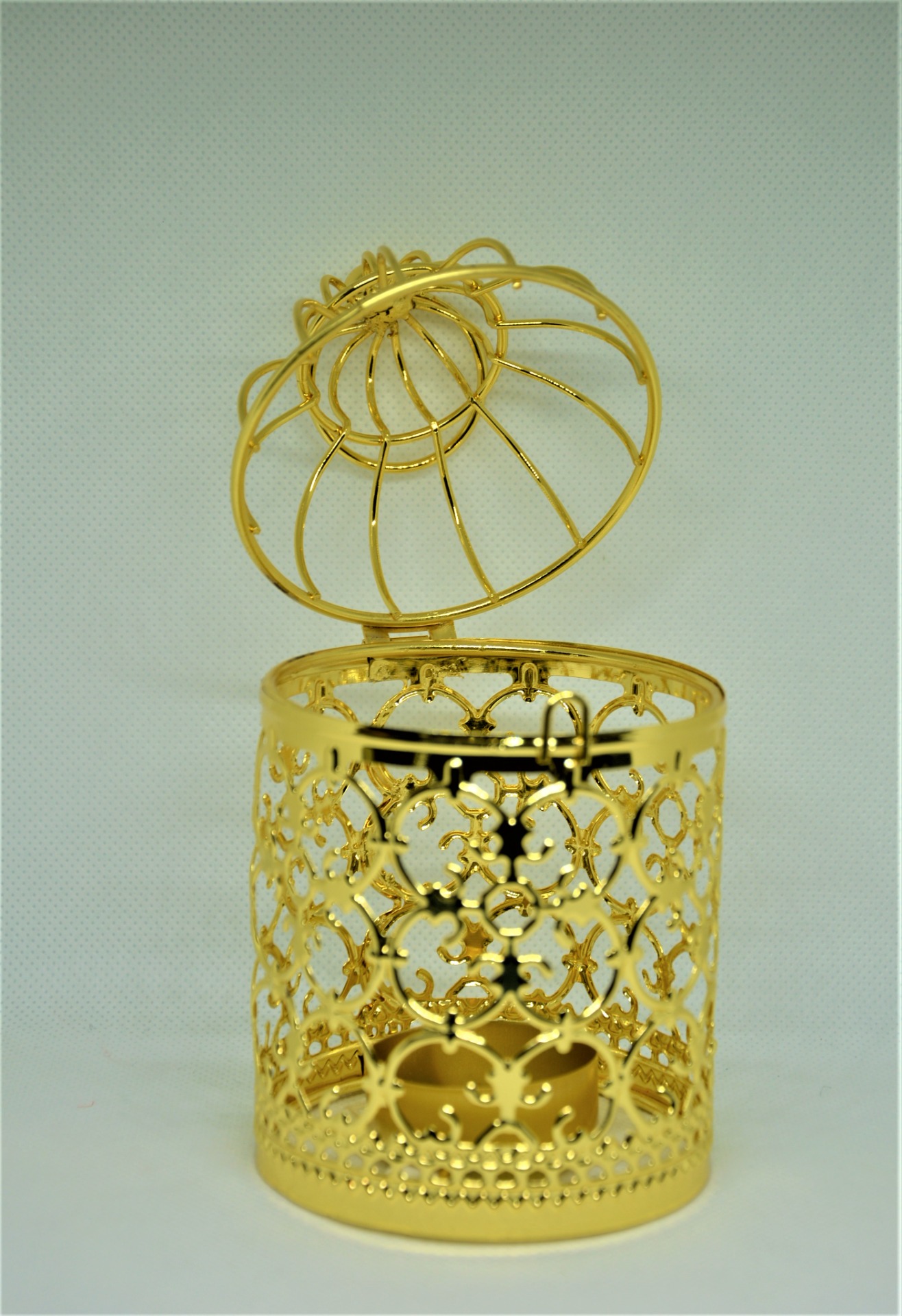 Svícen na čajovou svíčku ve tvaru ptačí klece s uchem na zavěšení. Materiál: kov.