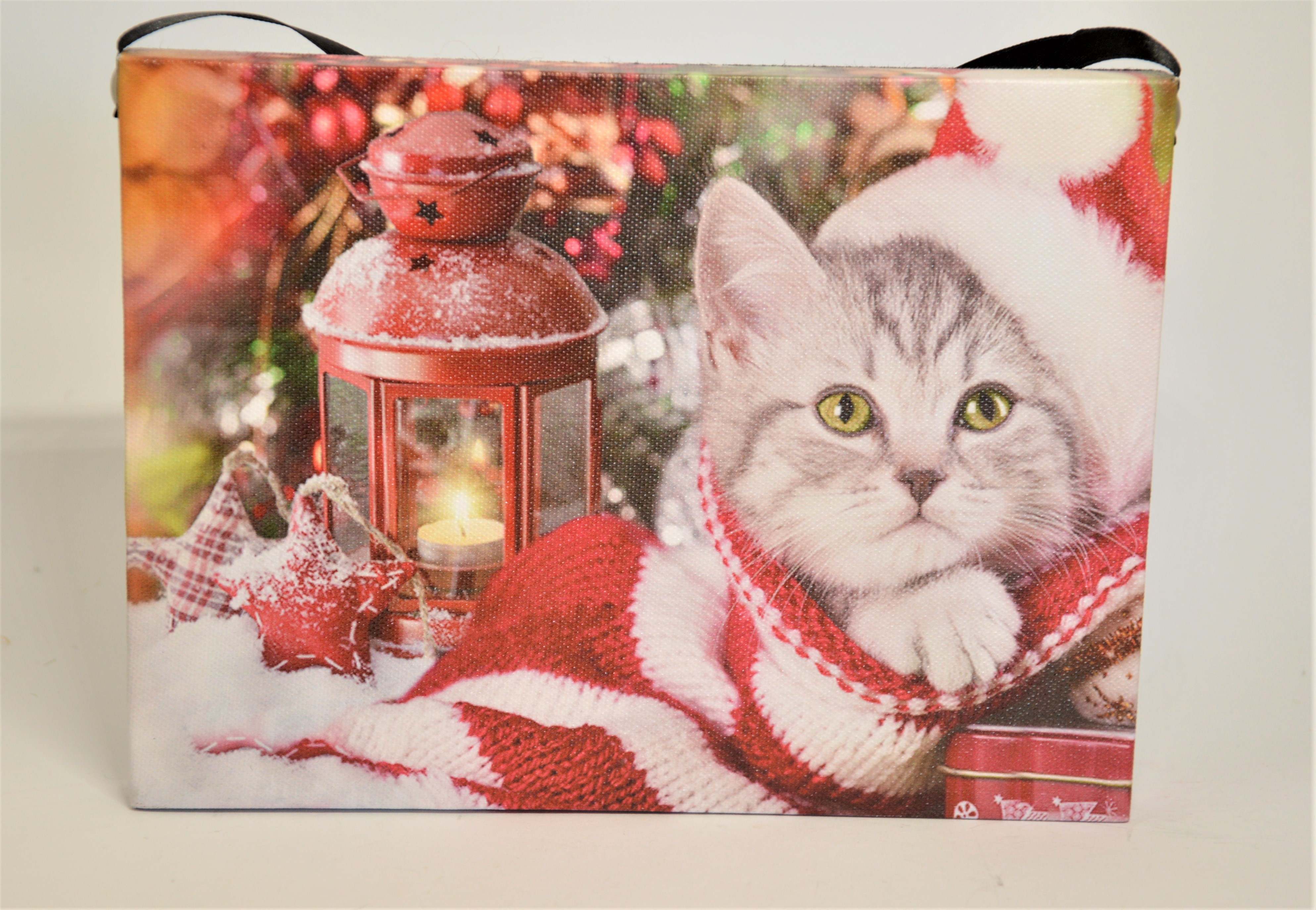 Svítící obraz Vánoční kočka - roztomilá zachumlaná kočka v kombinaci se zimním zátiším v podobě červené lucerny a ozdob vykouzlí úsměv na tváři.