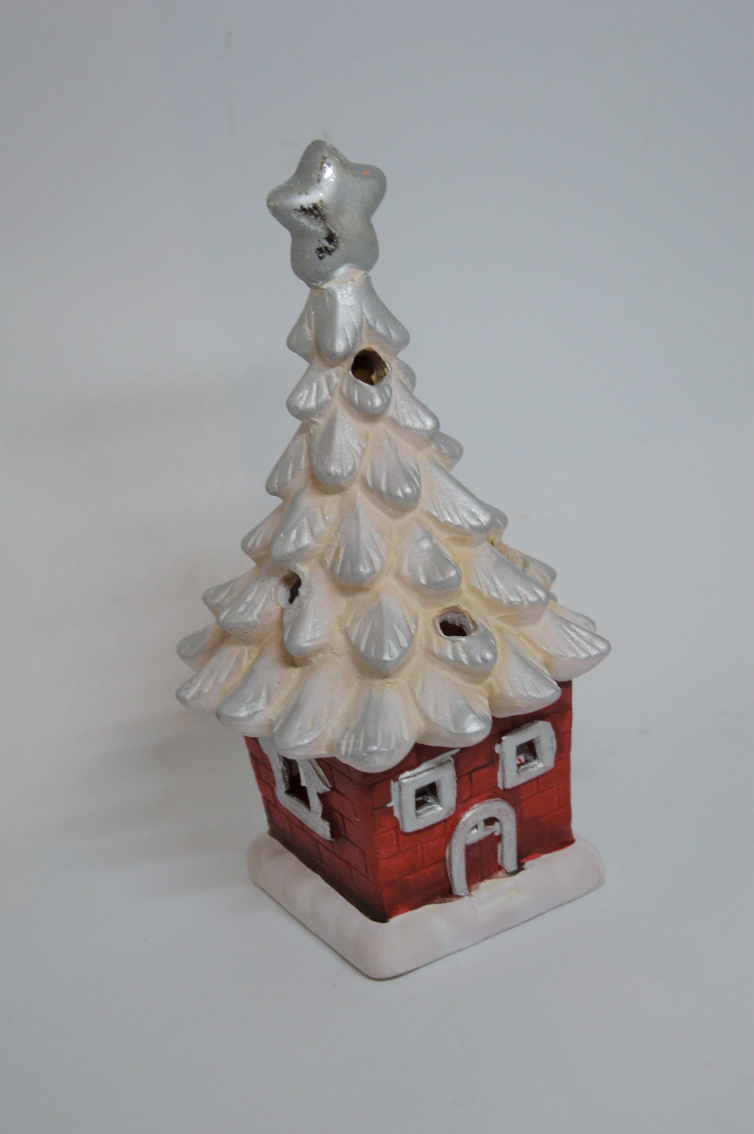 Vánoční svícen domeček - červený keramický domeček s vysokou zasněženou střechou. Nahoře zdobený stříbrnou hvězdičku.