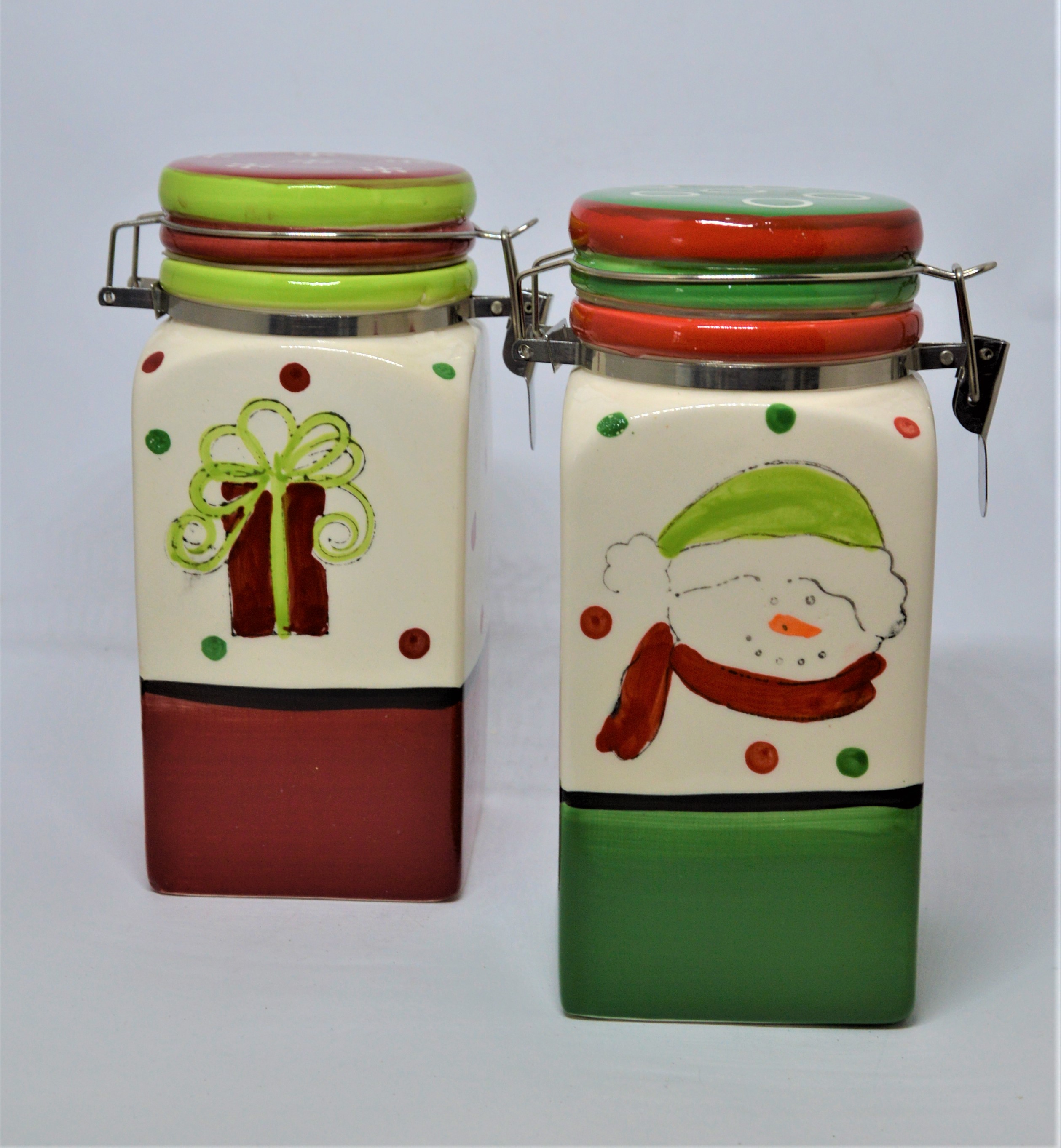 Vánoční dóza - dekorativní zeleno-červená keramická dóza v tradičních vánočních barvách, s odklápěcím víkem a zdobená puntíky a obrázkem dárku, sněhuláka nebo Santa Clause (dodáváme dle aktuální skladové dostupnosti - bez možnosti výběru).