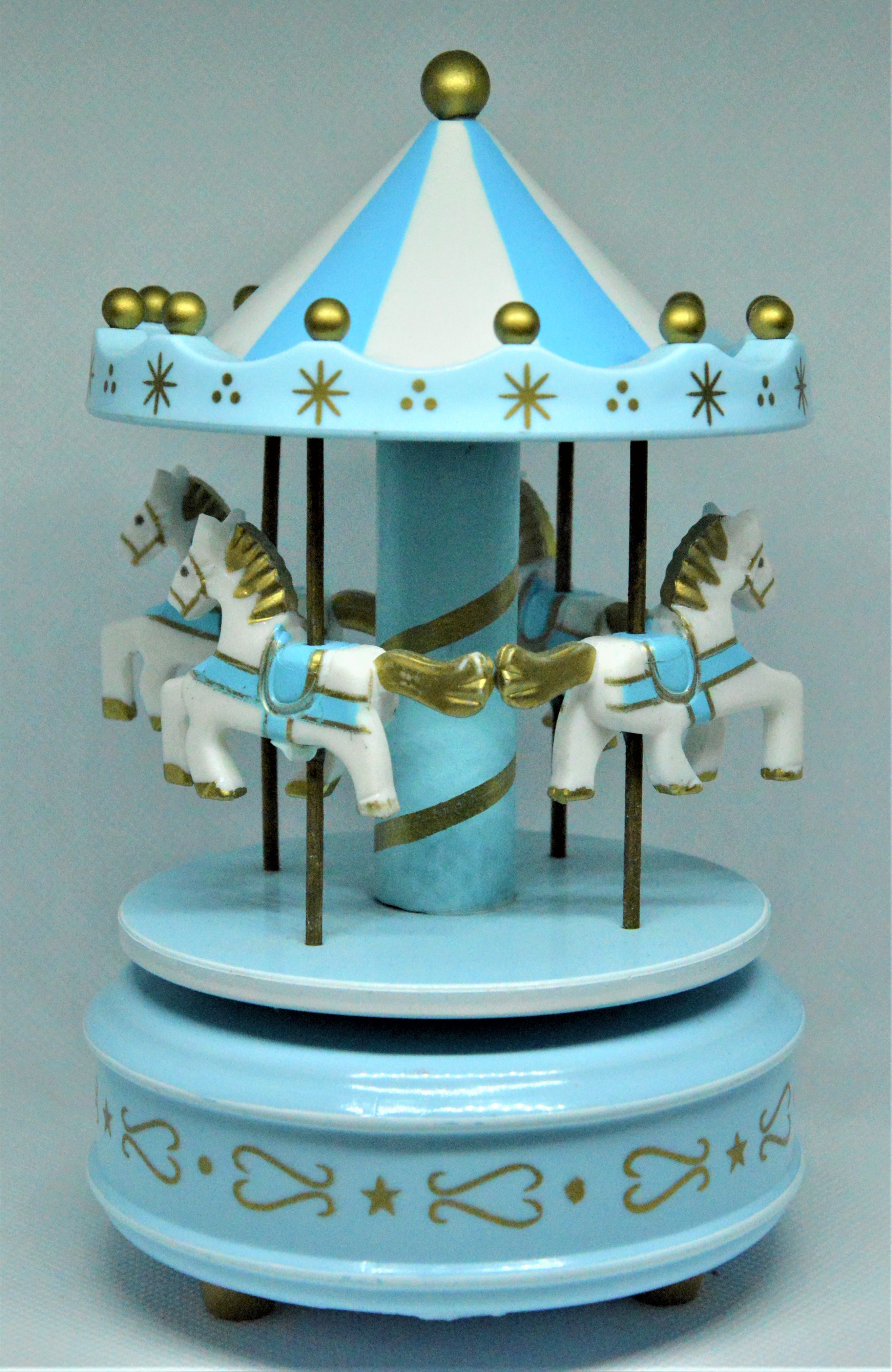 Vánoční hrající kolotoč s koníky - dřevěný, v modro-bílo-zlatém provedení se čtyřmi koníky.
