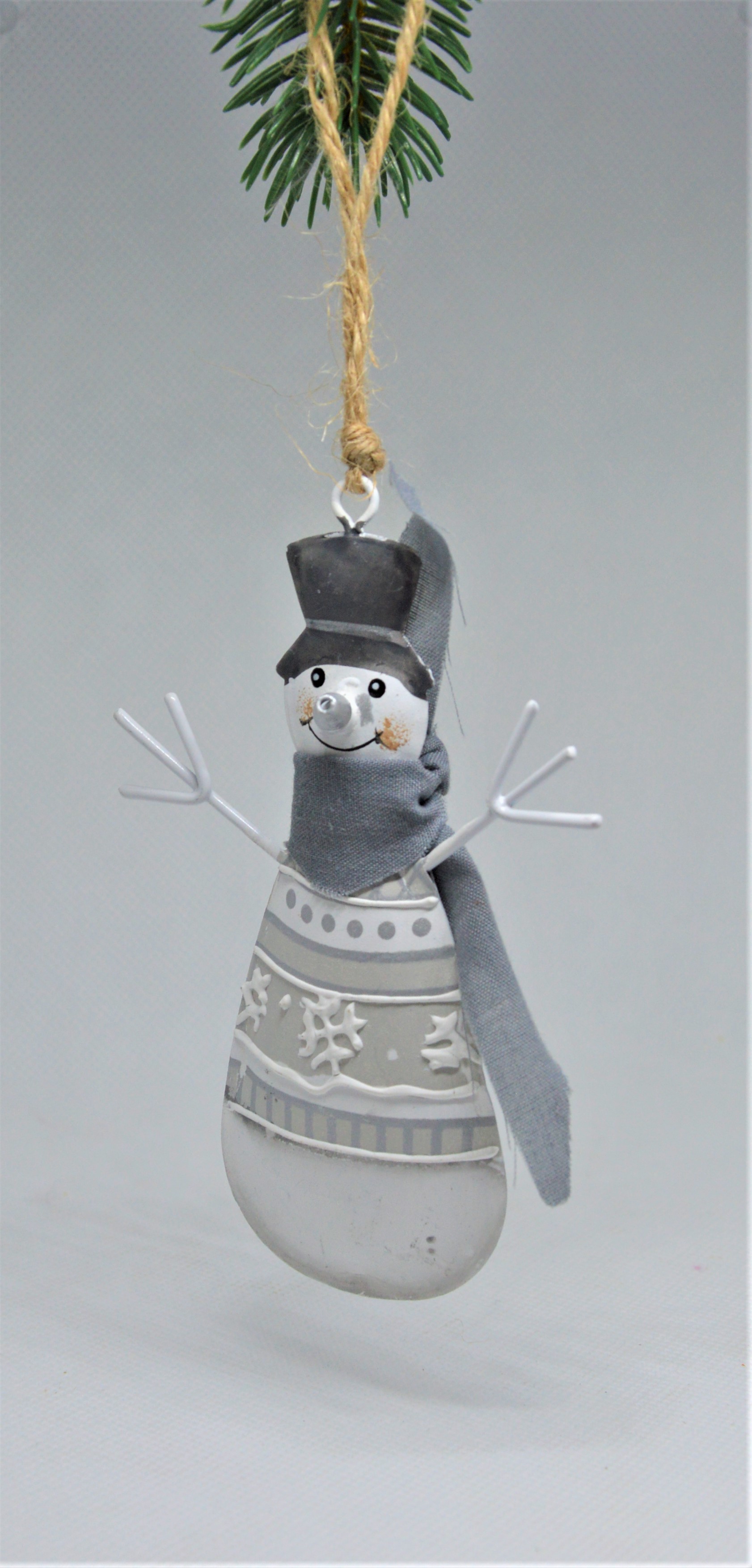 Vánoční ozdoba sněhulák - rozkošný šedo-bílý plechový sněhulák na jutovém provázku s drátěným nosem, šedým kloboukem a šálou, místo rukou má větvičky.