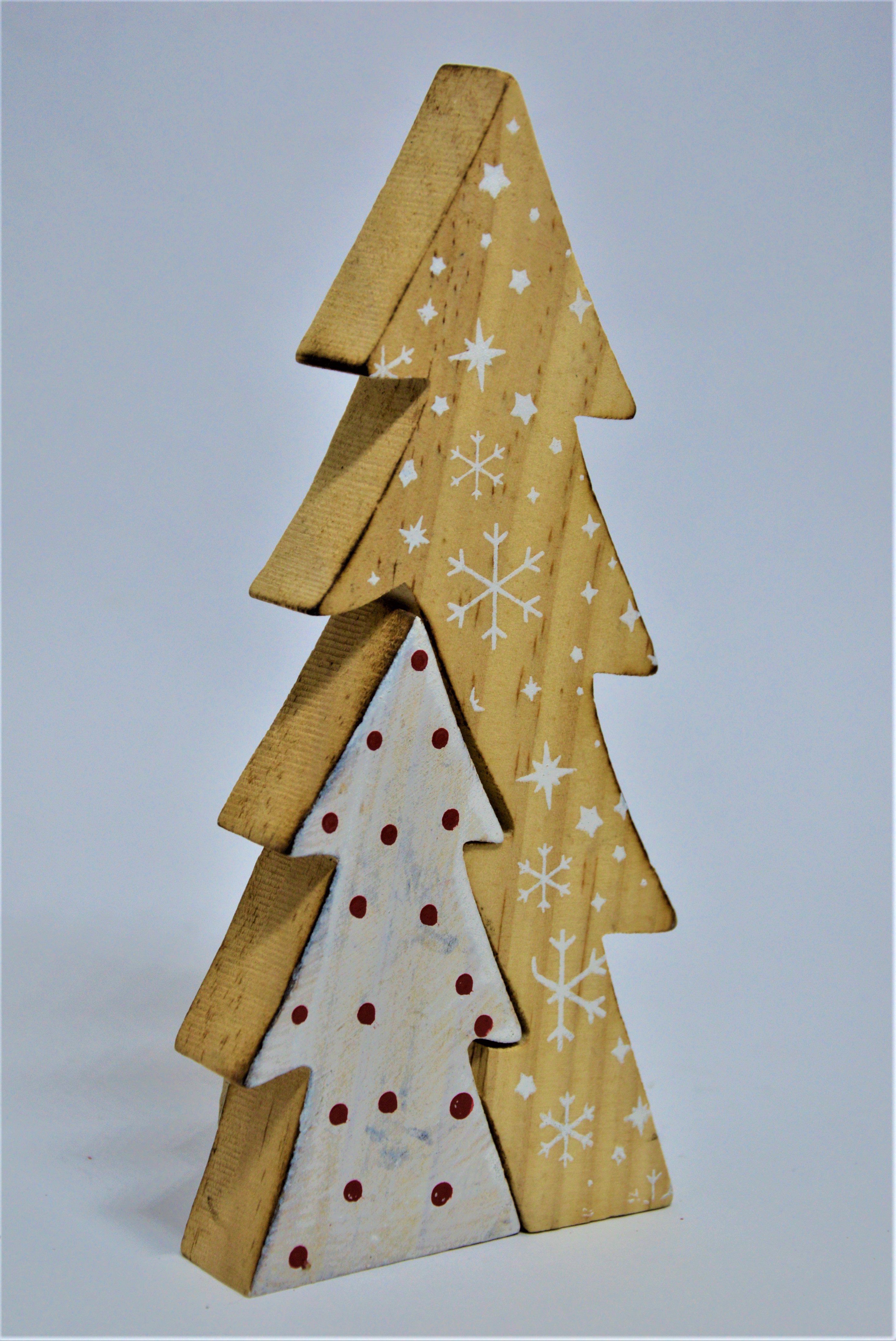 Vánoční stromeček dřevěný - dvoudílná vánoční dekorace v podobě dvou stromečků umístěných v jednom - jeden v přírodní barvě s bílými vločkami a hvězdičkami, druhý bílý zdobený červenými puntíky.