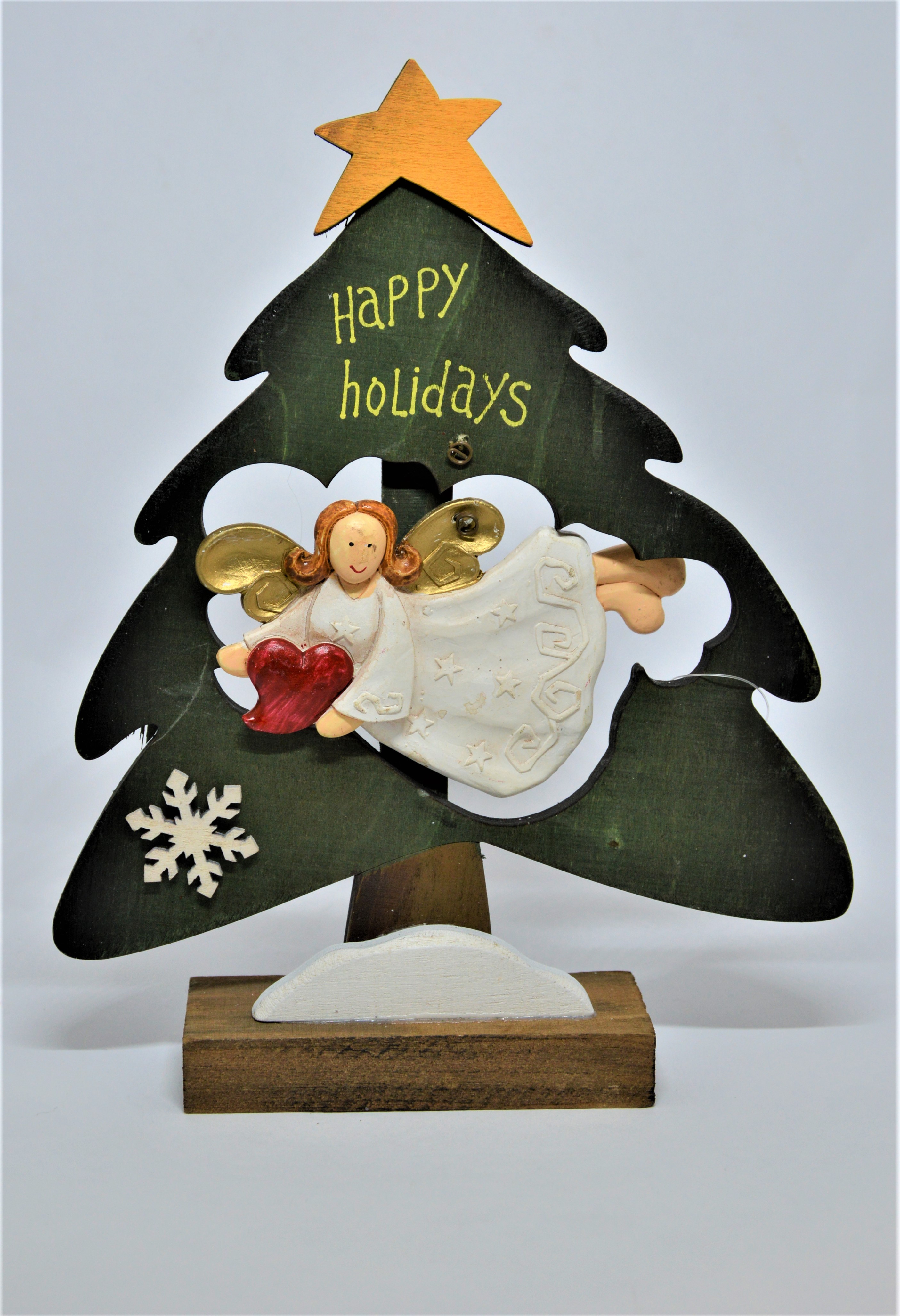 Vánoční stromeček - zelený dřevěný stromeček se žlutou hvězdou, nápisem Happy Holidays a zavěšeným bílým andělíčkem uprostřed, který drží červené srdíčko - symbol lásky.