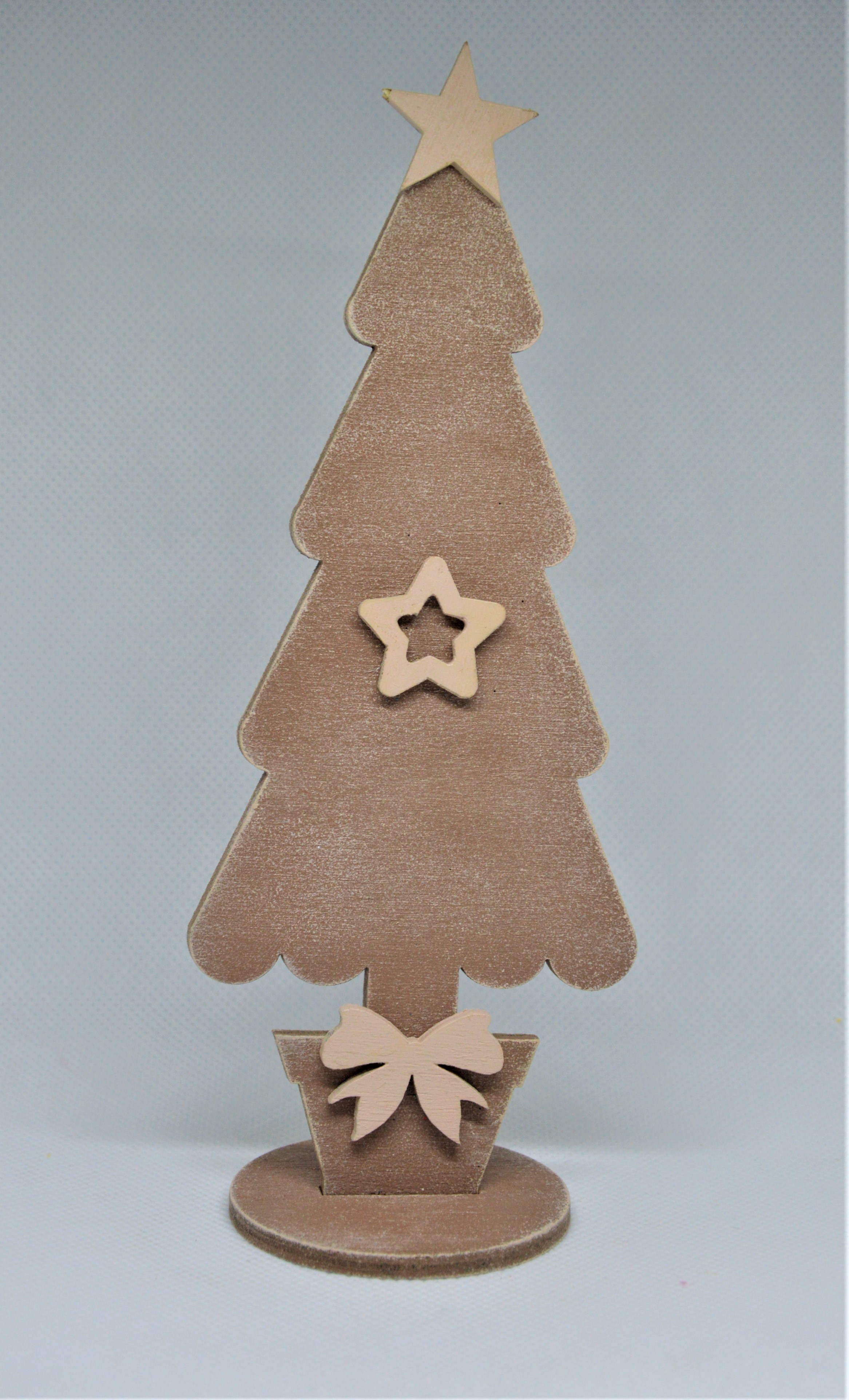 Vánoční stromeček - menší dřevěný stromeček ve starorůžové barvě, umístěný v květináči, ozdobený světle růžovou mašlí. Uprostřed a na špici zpestřen zlatými hvězdami.