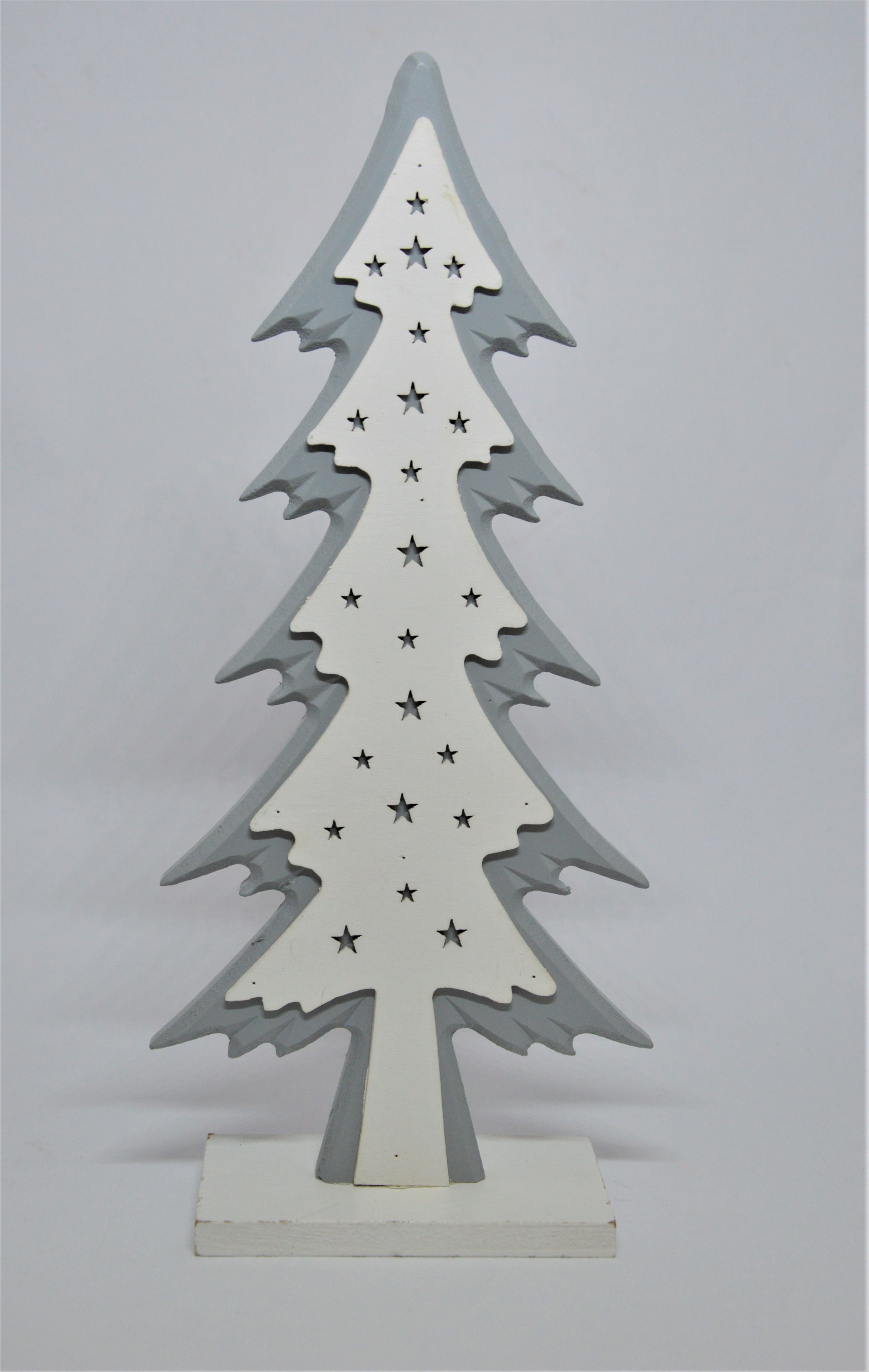 Vánoční stromeček - dřevěný stromeček v bílo-šedém provedení zdobený drobnými vyřezávanými hvězdičkami.