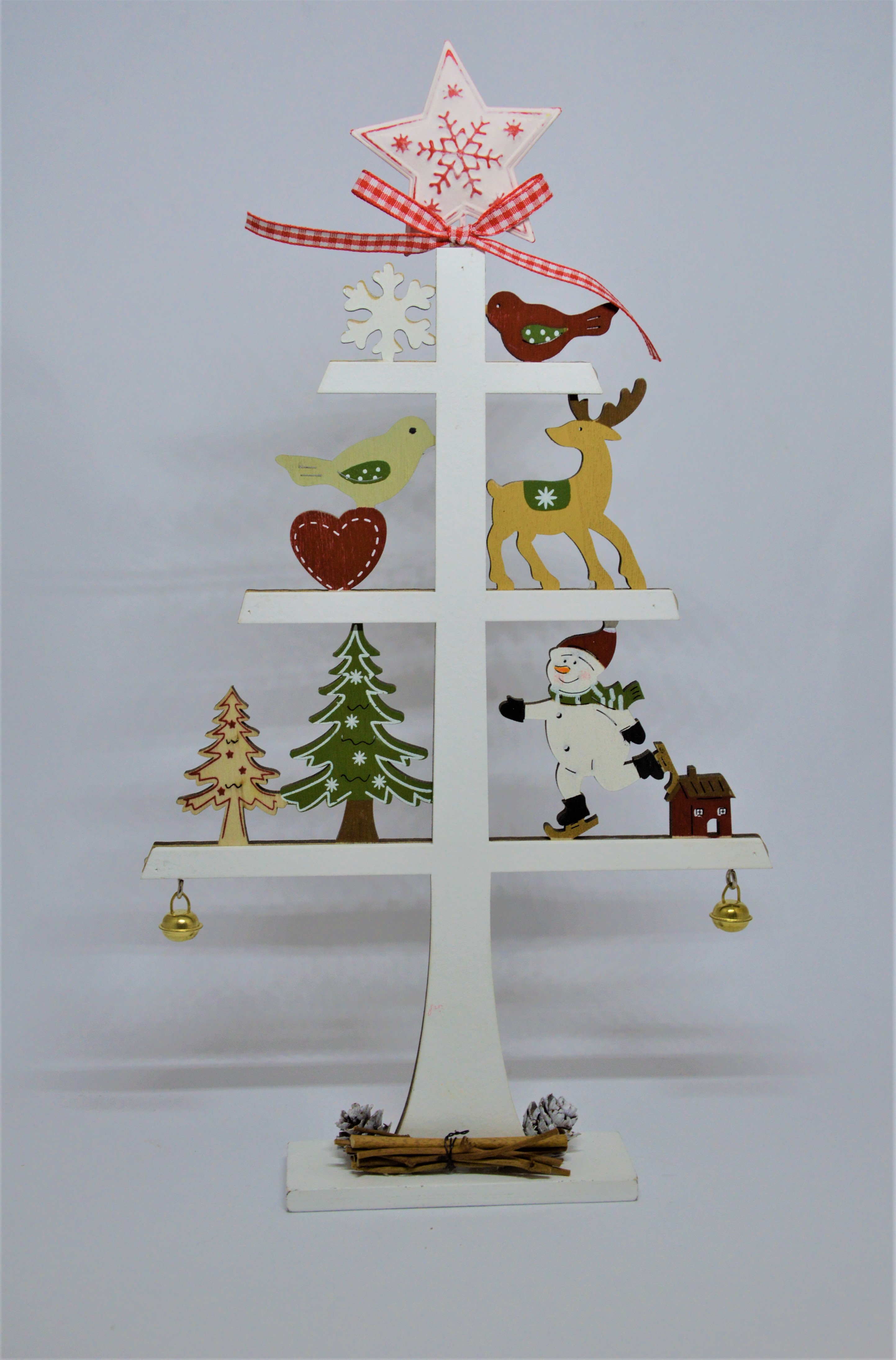 Vánoční stromeček - netypické provedení klasické vánoční dekorace - jednoduchý bílý dřevěný stromeček umístěný na podstavci je bohatě zdobený roztomilými barevnými zvířátky (ptáčky, sobem), sněhulákem, stromečky, vločkami, na spodních větvích ozvláštněn dvěma rolničkami.. Nahoře nechybí hvězda a bílo-červená mašlička.